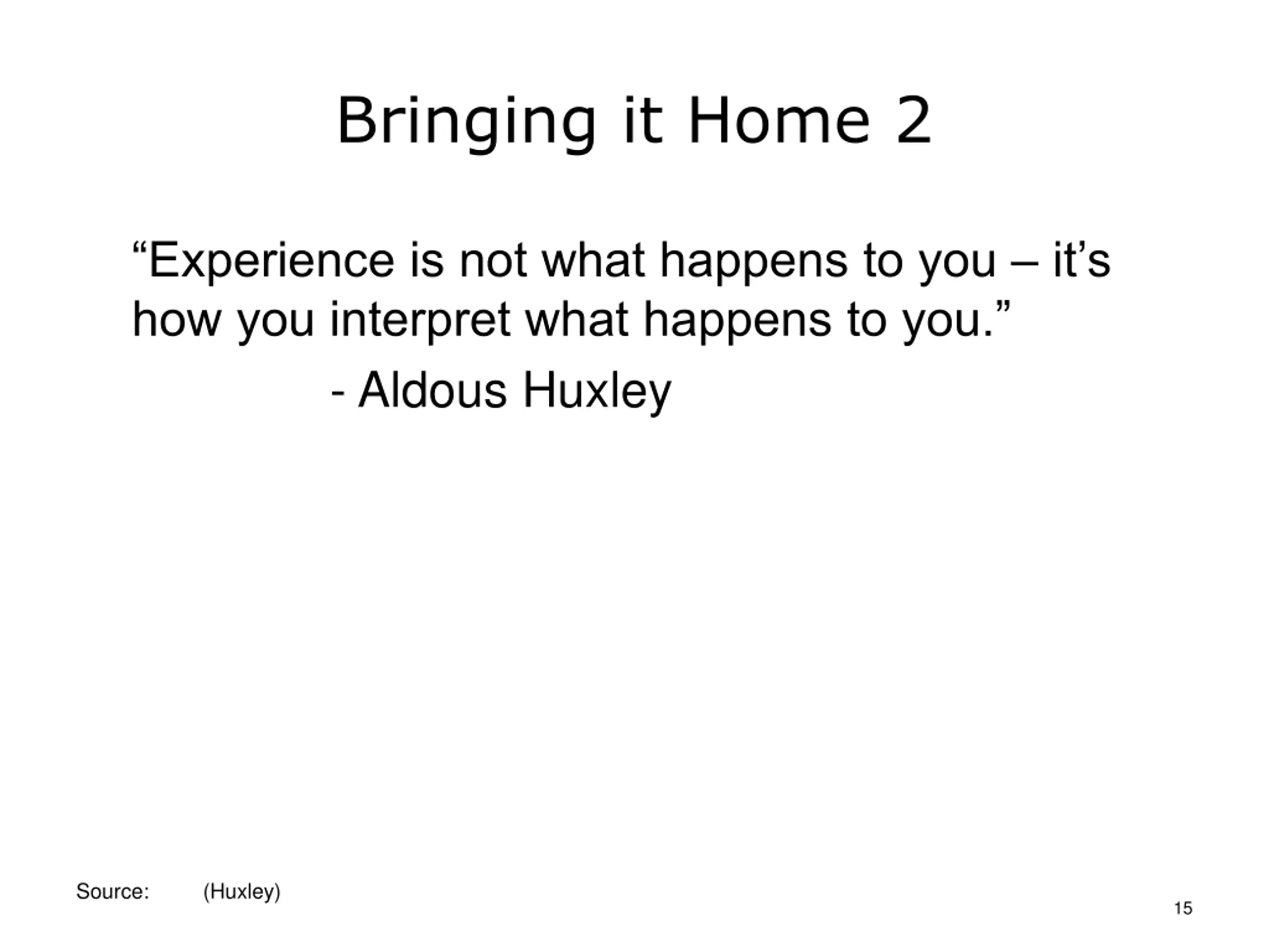 Bringing it Home 2 Experience is not what happens to you it s how you interpret what happens to you. - Aldous Huxley Source: (Huxley) 15