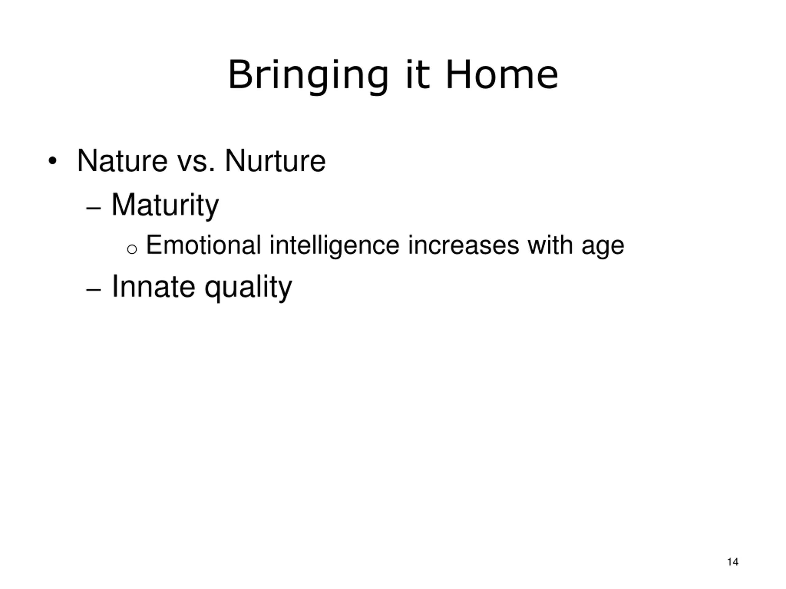 Bringing it Home Nature vs. Nurture Maturity o Emotional intelligence increases with age Innate quality 14