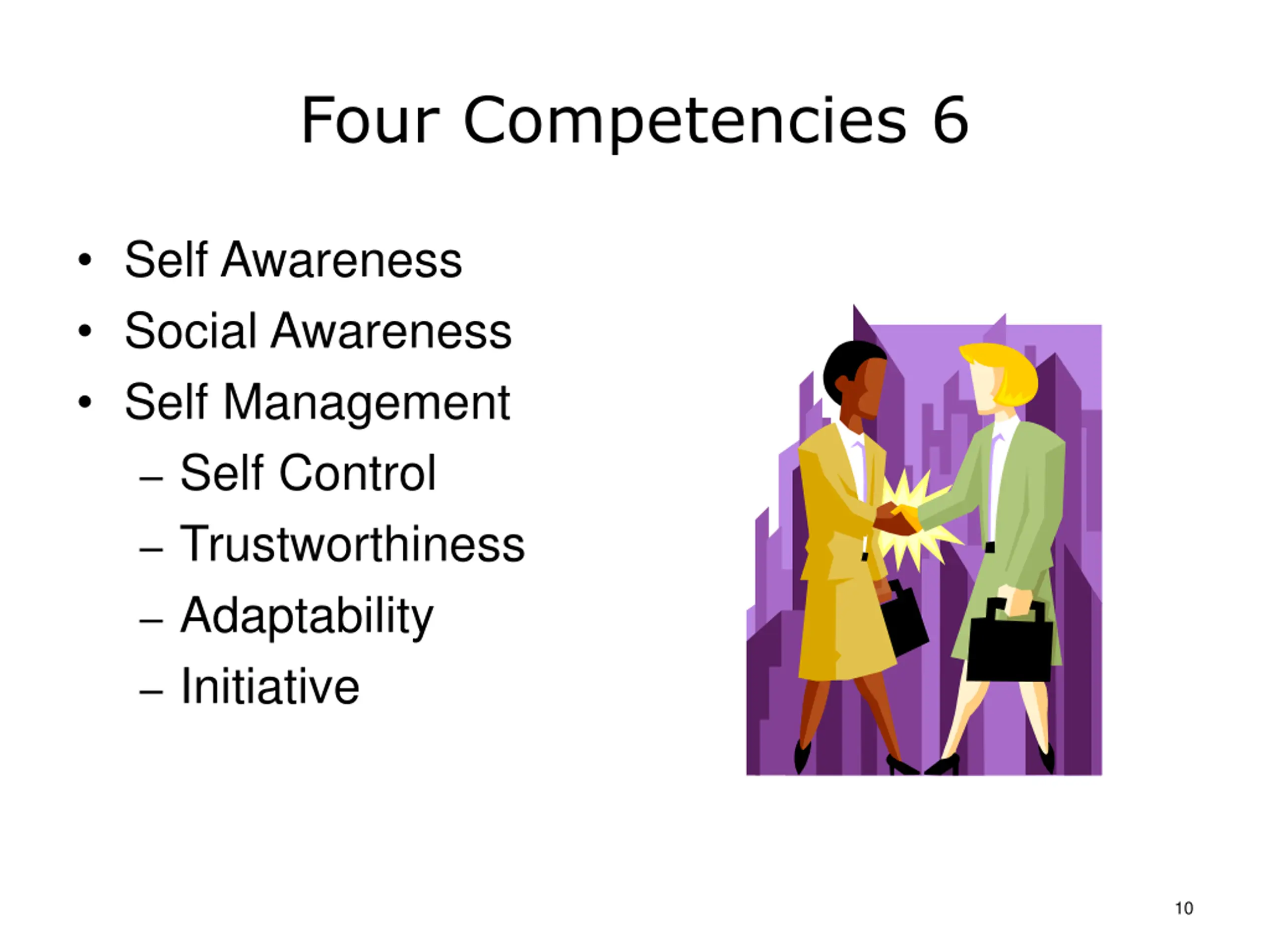 Four Competencies 6 Self Awareness Social Awareness Self Management Self Control Trustworthiness Adaptability Initiative 10