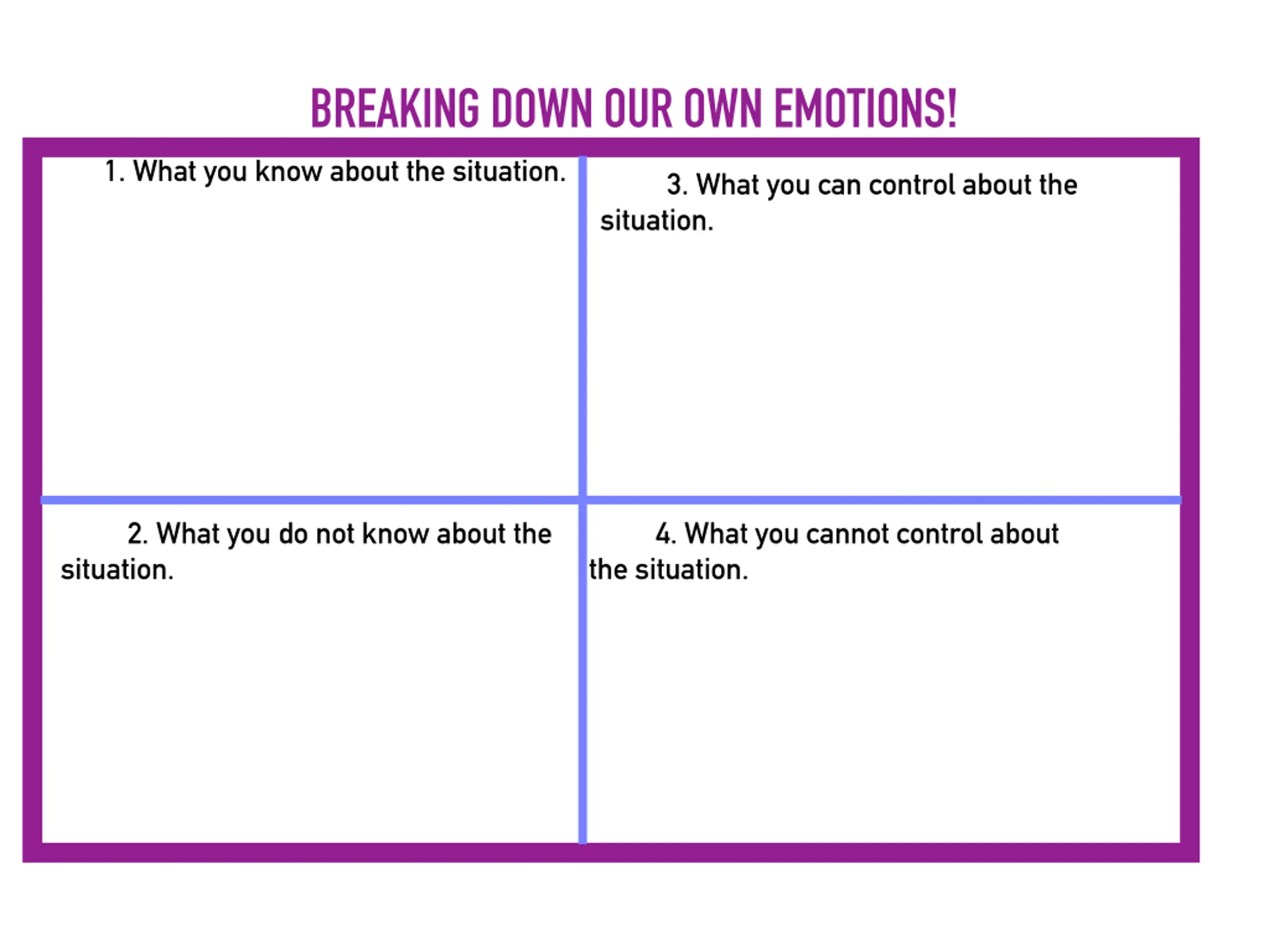BREAKING DOWN OUR OWN EMOTIONS! 1. What you know about the situation. 3. What you can control about the situation. 2. What you do not know about the situation. 4. What you cannot control about the situation.