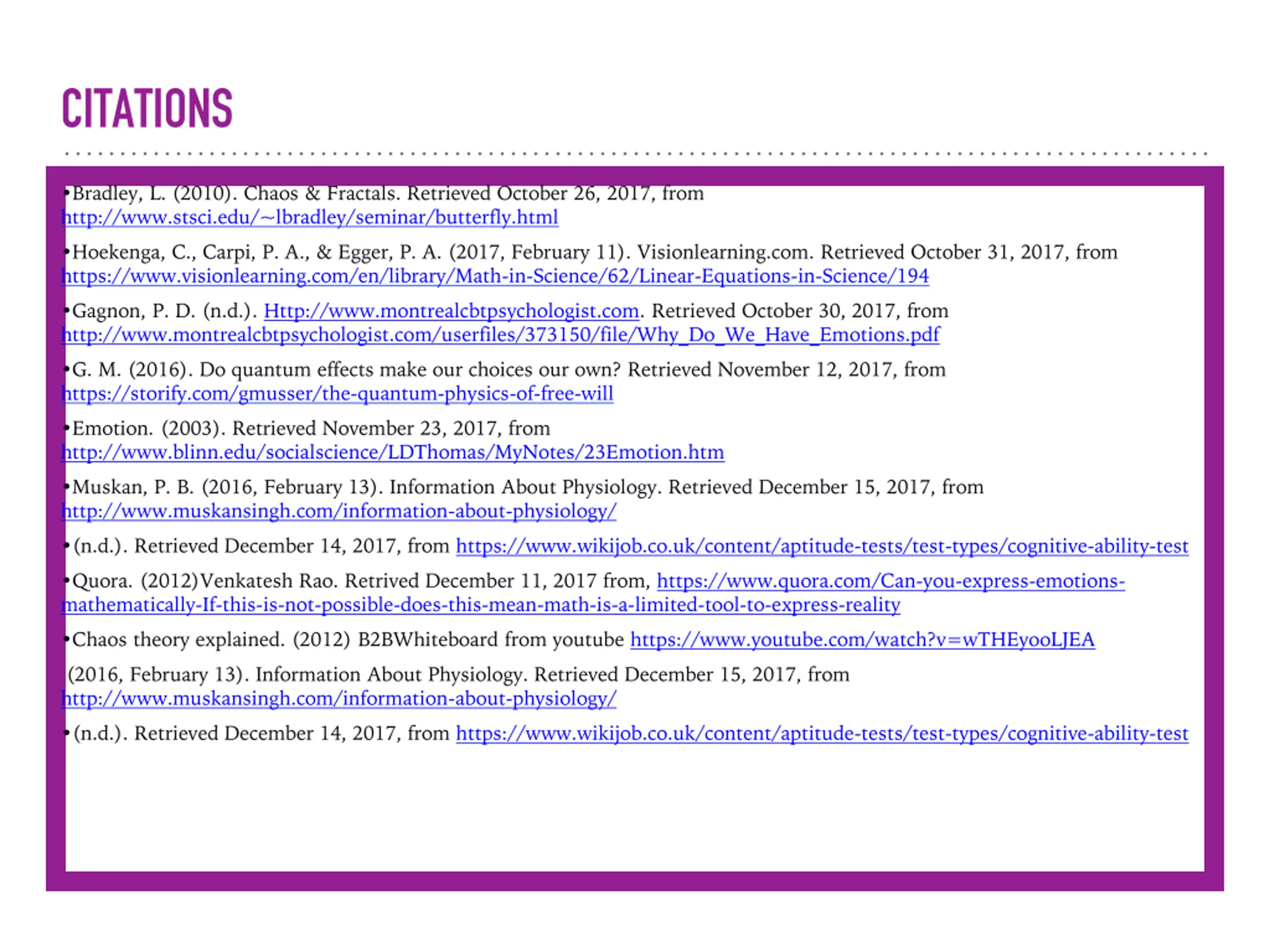 CITATIONS Bradley, L. (2010). Chaos & Fractals. Retrieved October 26, 2017, from http://www.stsci.edu/~lbradley/seminar/butterfly.html Hoekenga, C., Carpi, P. A., & Egger, P. A. (2017, February 11). Visionlearning.com. Retrieved October 31, 2017, from https://www.visionlearning.com/en/library/Math-in-Science/62/Linear-Equations-in-Science/194 Gagnon, P. D. (n.d.). Http://www.montrealcbtpsychologist.com. Retrieved October 30, 2017, from http://www.montrealcbtpsychologist.com/userfiles/373150/file/Why_Do_We_Have_Emotions.pdf G. M. (2016). Do quantum effects make our choices our own? Retrieved November 12, 2017, from https://storify.com/gmusser/the-quantum-physics-of-free-will Emotion. (2003). Retrieved November 23, 2017, from http://www.blinn.edu/socialscience/LDThomas/MyNotes/23Emotion.htm Muskan, P. B. (2016, February 13). Information About Physiology. Retrieved December 15, 2017, from http://www.muskansingh.com/information-about-physiology/ (n.d.). Retrieved December 14, 2017, from https://www.wikijob.co.uk/content/aptitude-tests/test-types/cognitive-ability-test Quora. (2012)Venkatesh Rao. Retrived December 11, 2017 from, https://www.quora.com/Can-you-express-emotions- mathematically-If-this-is-not-possible-does-this-mean-math-is-a-limited-tool-to-express-reality Chaos theory explained. (2012) B2BWhiteboard from youtube https://www.youtube.com/watch?v=wTHEyooLJEA (2016, February 13). Information About Physiology. Retrieved December 15, 2017, from http://www.muskansingh.com/information-about-physiology/ (n.d.). Retrieved December 14, 2017, from https://www.wikijob.co.uk/content/aptitude-tests/test-types/cognitive-ability-test