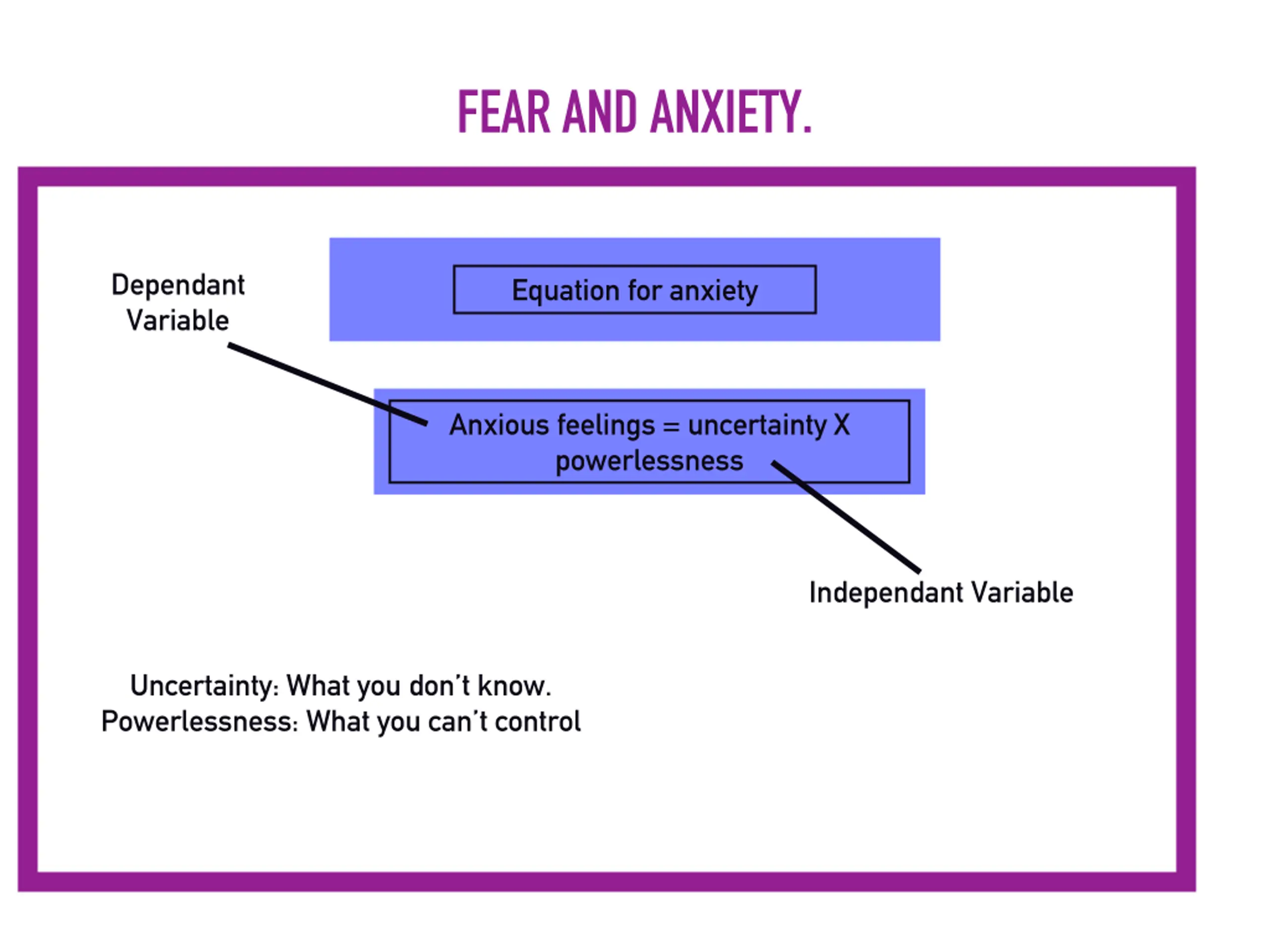 FEAR AND ANXIETY. Dependant Variable Equation for anxiety Anxious feelings = uncertainty X powerlessness Independant Variable Uncertainty: What you don t know. Powerlessness: What you can t control