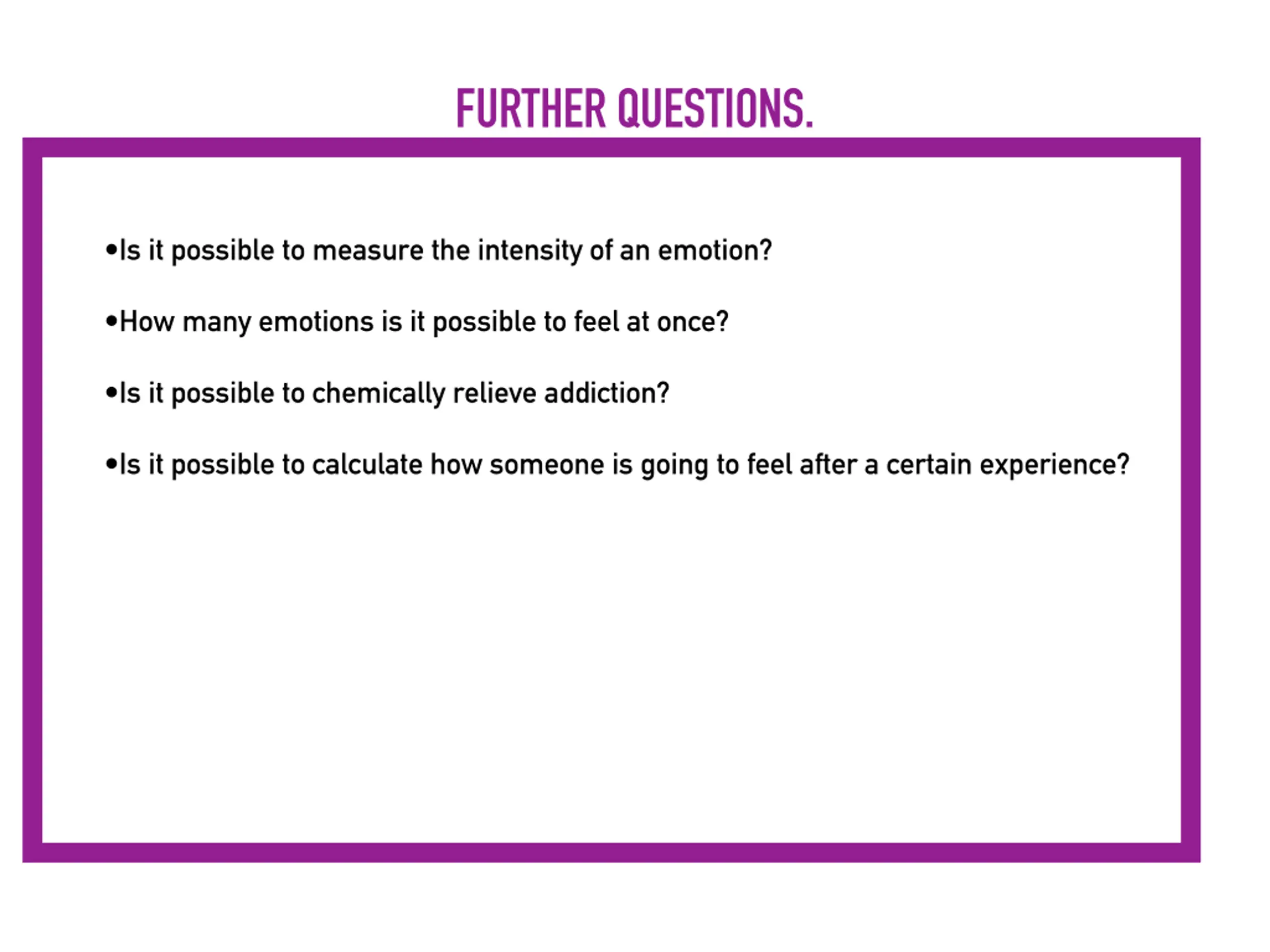 FURTHER QUESTIONS. Is it possible to measure the intensity of an emotion? How many emotions is it possible to feel at once? Is it possible to chemically relieve addiction? Is it possible to calculate how someone is going to feel after a certain experience?