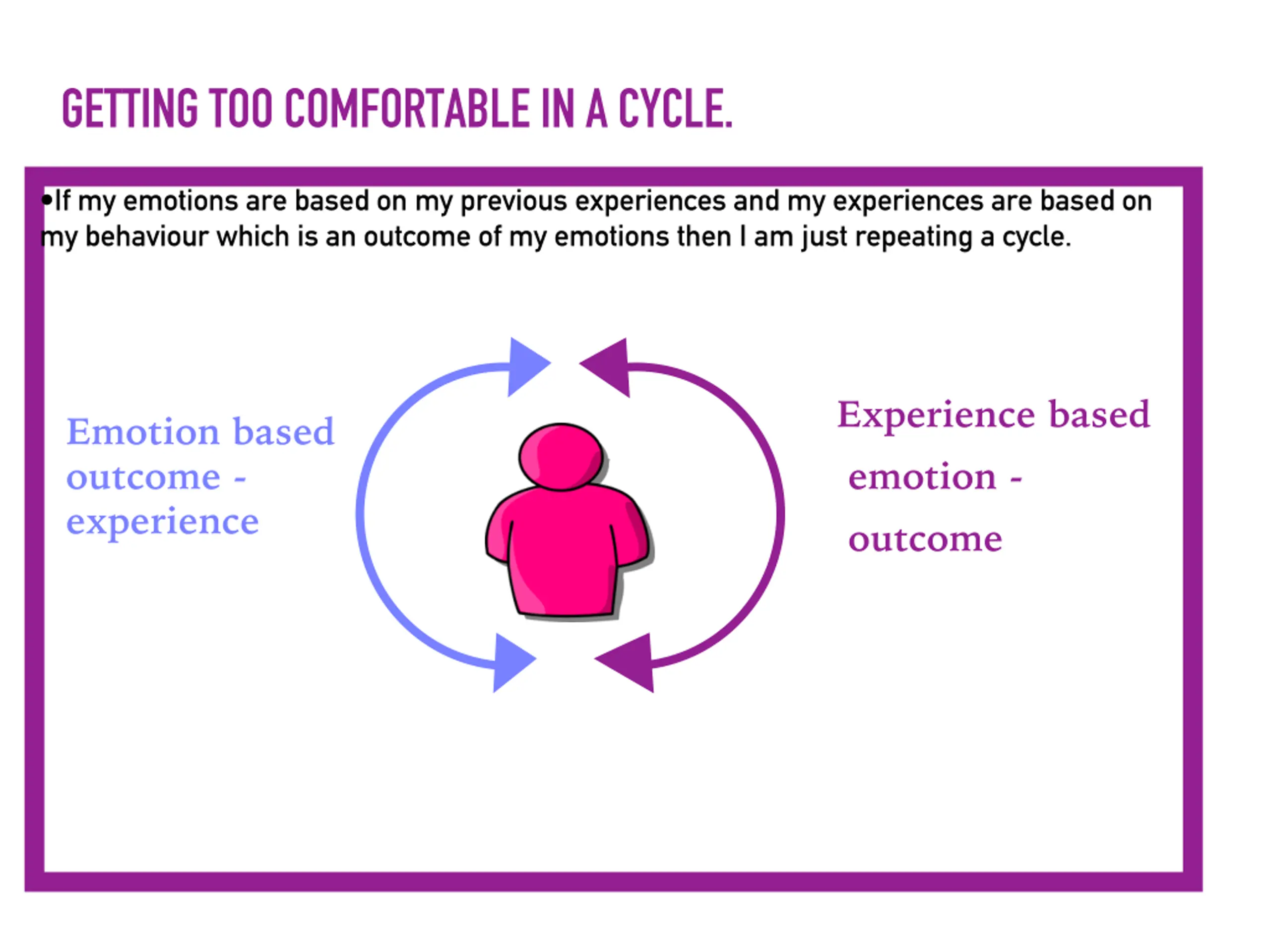 GETTING TOO COMFORTABLE IN A CYCLE. If my emotions are based on my previous experiences and my experiences are based on my behaviour which is an outcome of my emotions then I am just repeating a cycle. Experience based emotion - outcome Emotion based outcome - experience