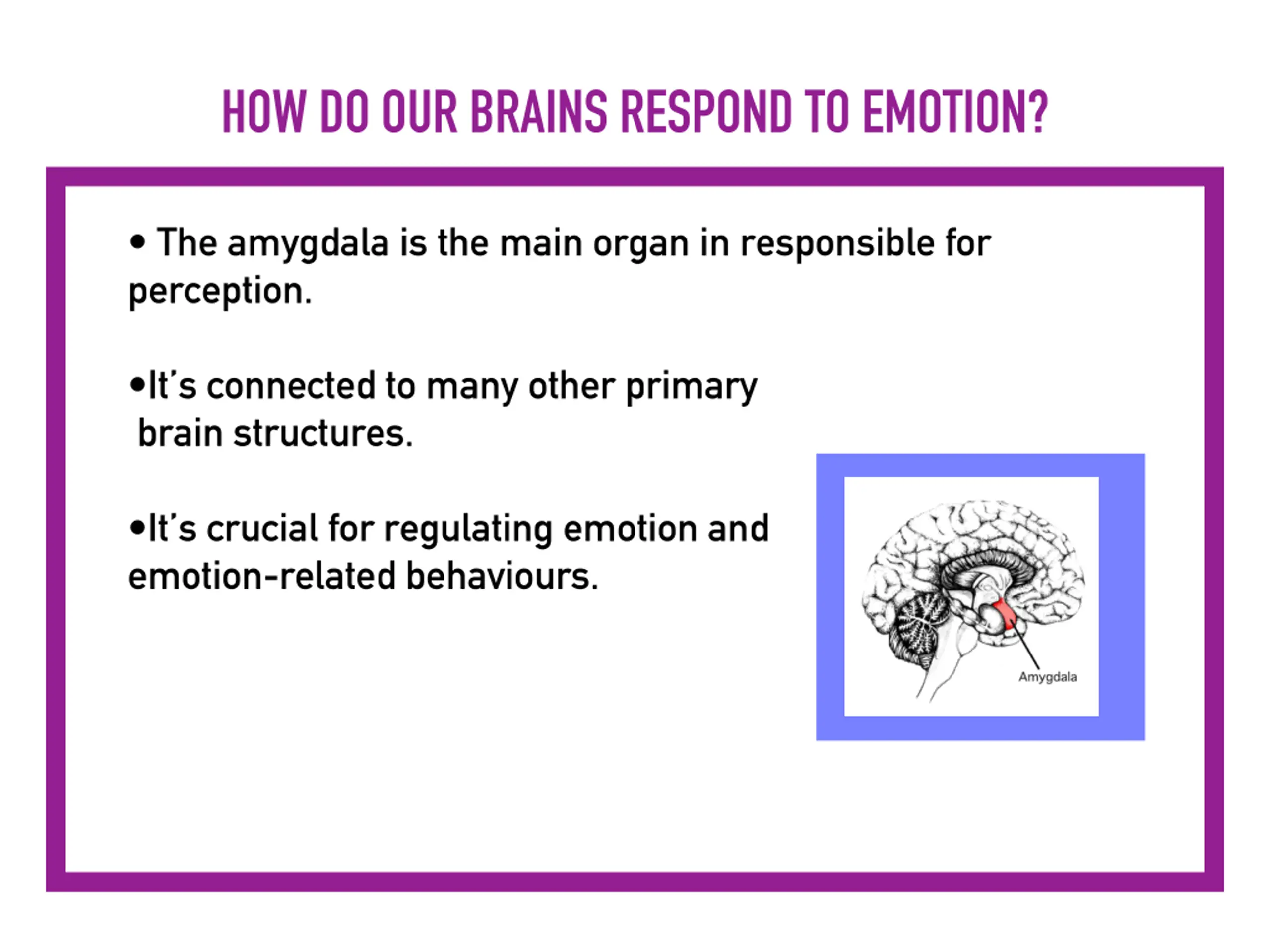 HOW DO OUR BRAINS RESPOND TO EMOTION? The amygdala is the main organ in responsible for perception. It s connected to many other primary brain structures. It s crucial for regulating emotion and emotion-related behaviours.