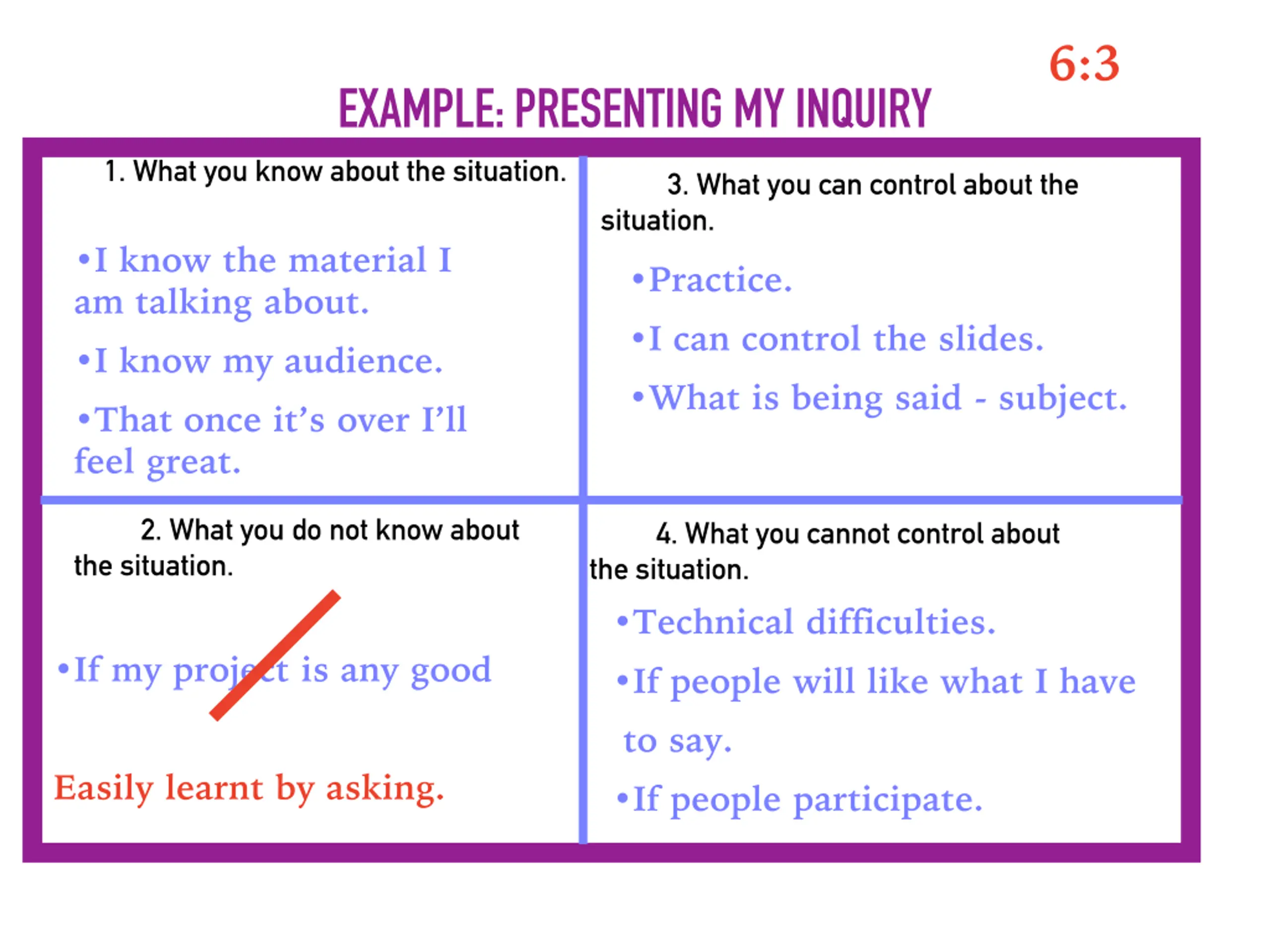 6:3 EXAMPLE: PRESENTING MY INQUIRY 1. What you know about the situation. 3. What you can control about the situation. I know the material I am talking about. I know my audience. That once it s over I ll feel great. Practice. I can control the slides. What is being said - subject. 2. What you do not know about the situation. 4. What you cannot control about the situation. Technical difficulties. If people will like what I have to say. If people participate. If my project is any good Easily learnt by asking.
