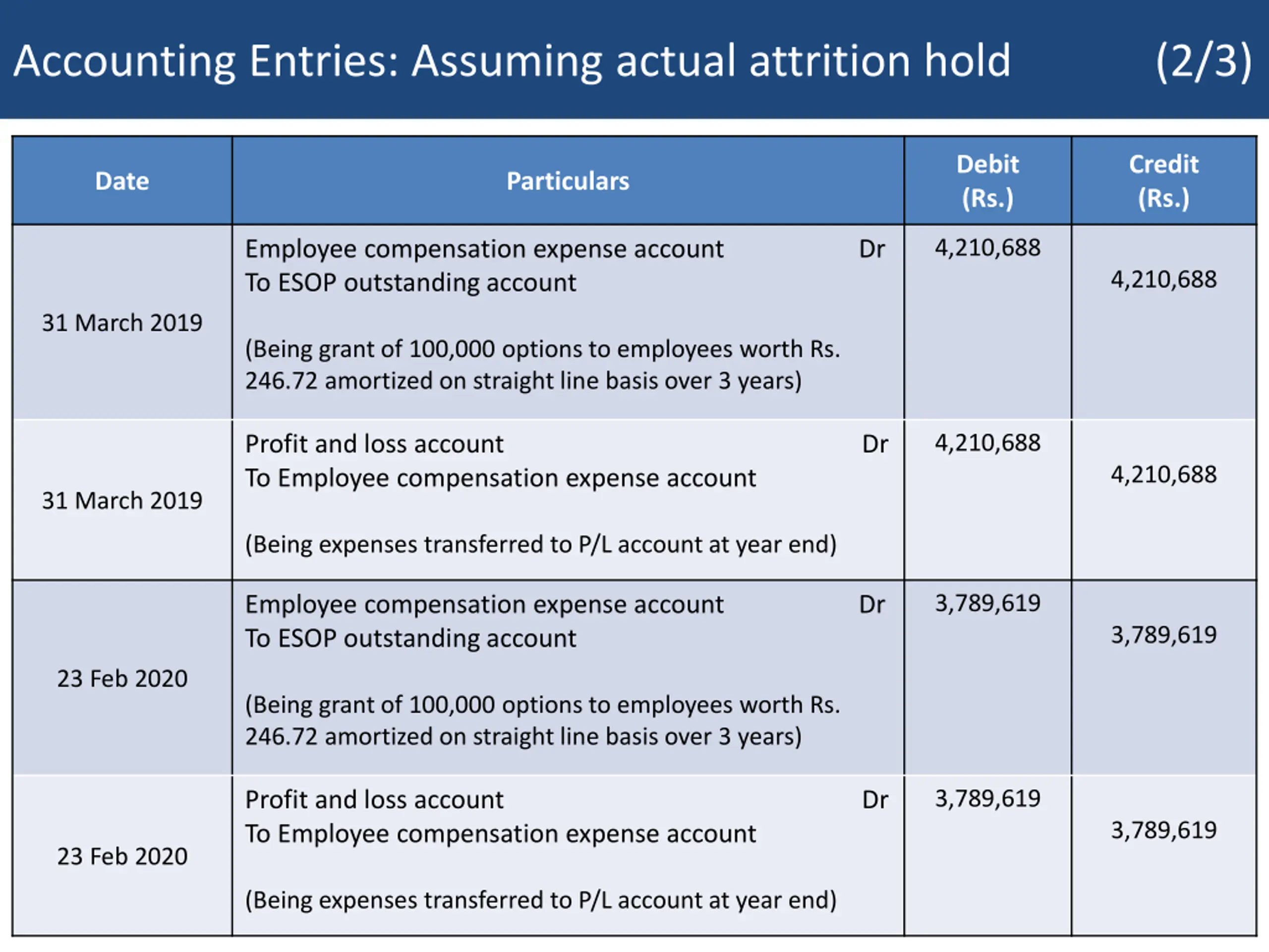 Accounting Entries: Assuming actual attrition hold (2/3) Debit (Rs.) Credit (Rs.) Date Particulars 4,210,688 Employee compensation expense account Dr To ESOP outstanding account 4,210,688 31 March 2019 (Being grant of 100,000 options to employees worth Rs. 246.72 amortized on straight line basis over 3 years) 4,210,688 Profit and loss account Dr To Employee compensation expense account 4,210,688 31 March 2019 (Being expenses transferred to P/L account at year end) 3,789,619 Employee compensation expense account Dr To ESOP outstanding account 3,789,619 23 Feb 2020 (Being grant of 100,000 options to employees worth Rs. 246.72 amortized on straight line basis over 3 years) 3,789,619 Profit and loss account Dr To Employee compensation expense account 3,789,619 23 Feb 2020 (Being expenses transferred to P/L account at year end)