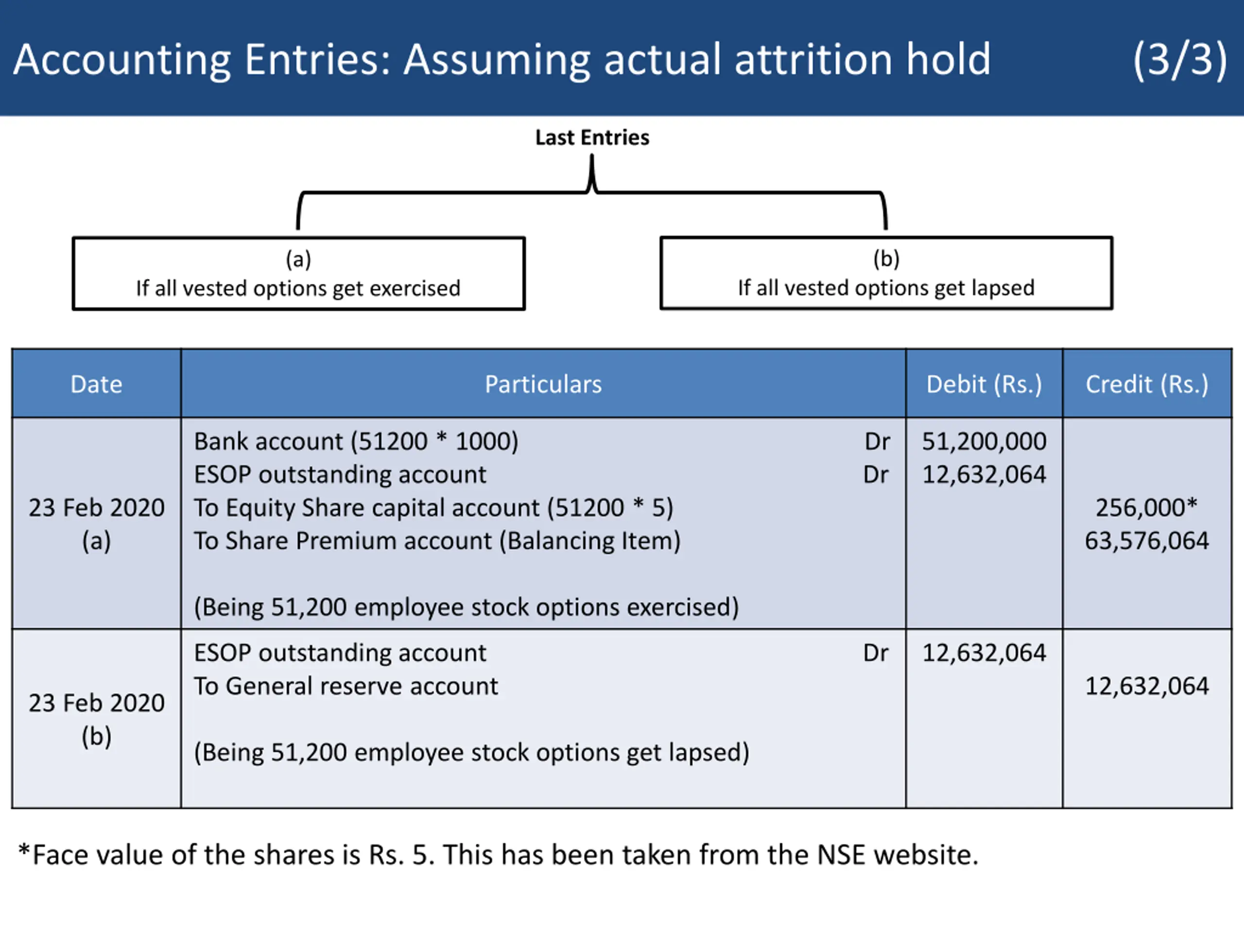 Accounting Entries: Assuming actual attrition hold (3/3) Last Entries (b) (a) If all vested options get lapsed If all vested options get exercised Date Particulars Debit (Rs.) Credit (Rs.) Bank account (51200 * 1000) Dr ESOP outstanding account Dr To Equity Share capital account (51200 * 5) To Share Premium account (Balancing Item) 51,200,000 12,632,064 23 Feb 2020 (a) 256,000* 63,576,064 (Being 51,200 employee stock options exercised) ESOP outstanding account Dr To General reserve account 12,632,064 12,632,064 23 Feb 2020 (b) (Being 51,200 employee stock options get lapsed) *Face value of the shares is Rs. 5. This has been taken from the NSE website.
