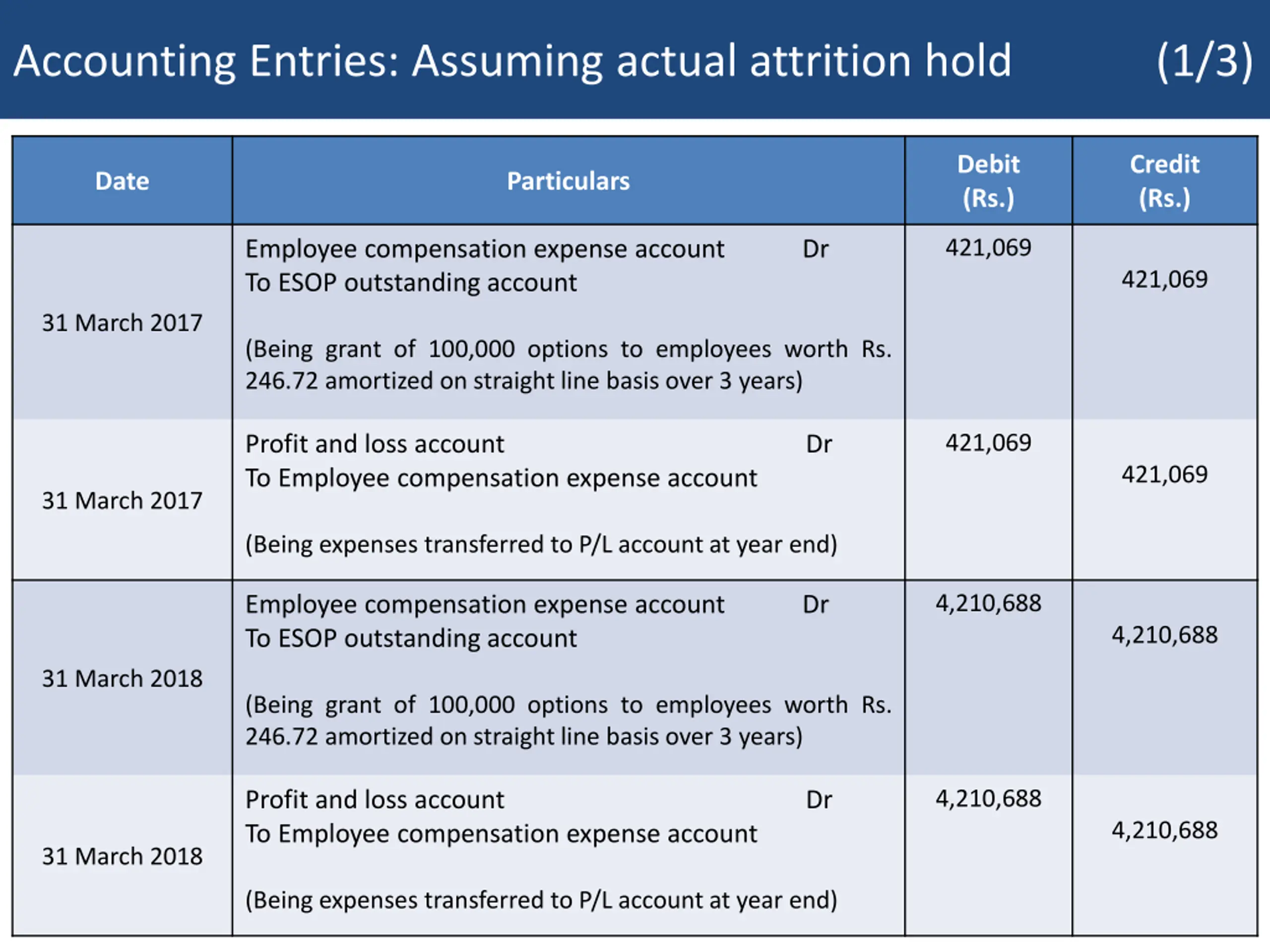 Accounting Entries: Assuming actual attrition hold (1/3) Debit (Rs.) Credit (Rs.) Date Particulars 421,069 Employee compensation expense account Dr To ESOP outstanding account 421,069 31 March 2017 (Being grant of 100,000 options to employees worth Rs. 246.72 amortized on straight line basis over 3 years) 421,069 Profit and loss account Dr To Employee compensation expense account 421,069 31 March 2017 (Being expenses transferred to P/L account at year end) 4,210,688 Employee compensation expense account Dr To ESOP outstanding account 4,210,688 31 March 2018 (Being grant of 100,000 options to employees worth Rs. 246.72 amortized on straight line basis over 3 years) 4,210,688 Profit and loss account Dr To Employee compensation expense account 4,210,688 31 March 2018 (Being expenses transferred to P/L account at year end)