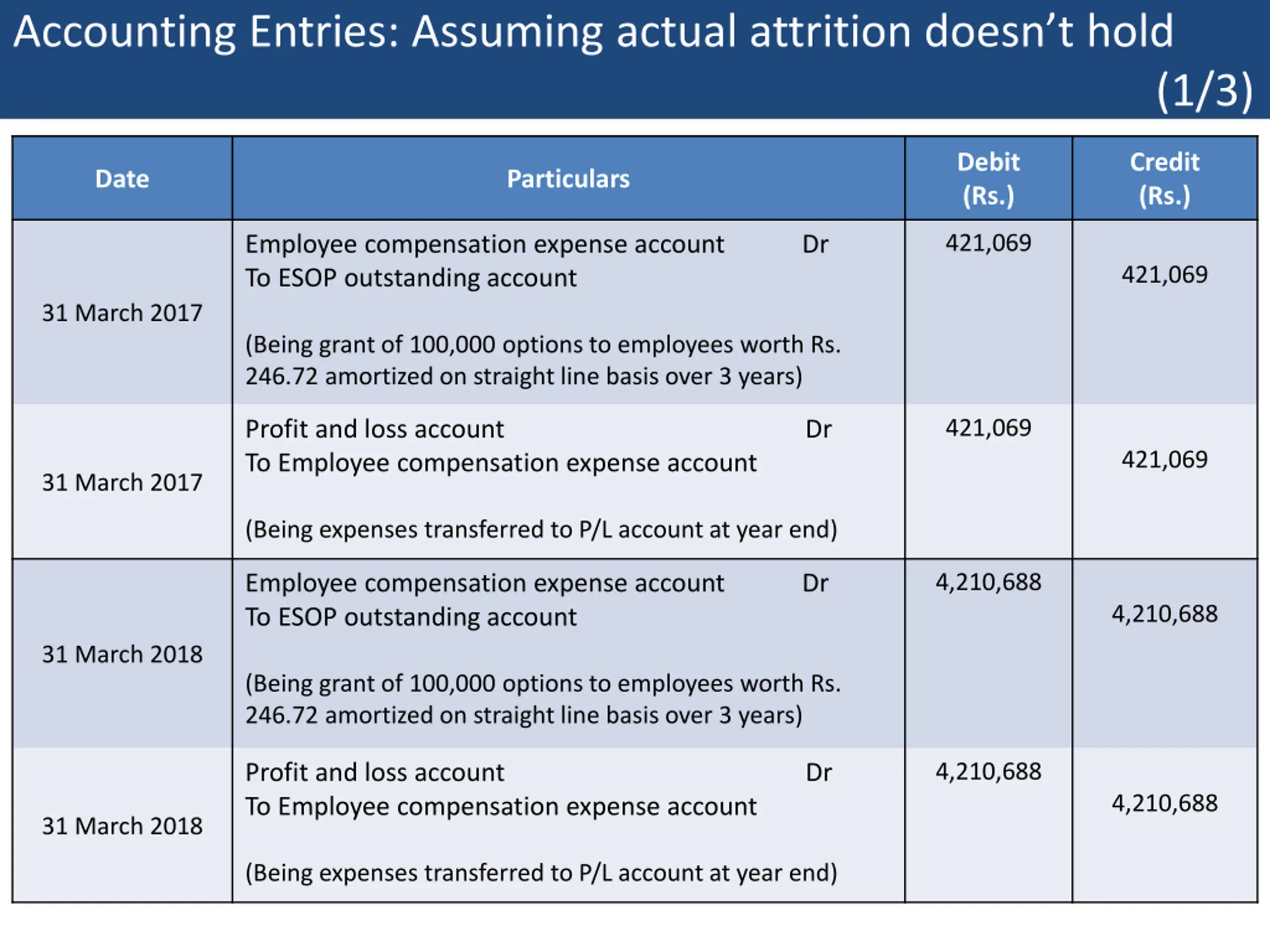 Accounting Entries: Assuming actual attrition doesnt hold (1/3) Debit (Rs.) Credit (Rs.) Date Particulars 421,069 Employee compensation expense account Dr To ESOP outstanding account 421,069 31 March 2017 (Being grant of 100,000 options to employees worth Rs. 246.72 amortized on straight line basis over 3 years) 421,069 Profit and loss account Dr To Employee compensation expense account 421,069 31 March 2017 (Being expenses transferred to P/L account at year end) 4,210,688 Employee compensation expense account Dr To ESOP outstanding account 4,210,688 31 March 2018 (Being grant of 100,000 options to employees worth Rs. 246.72 amortized on straight line basis over 3 years) 4,210,688 Profit and loss account Dr To Employee compensation expense account 4,210,688 31 March 2018 (Being expenses transferred to P/L account at year end)