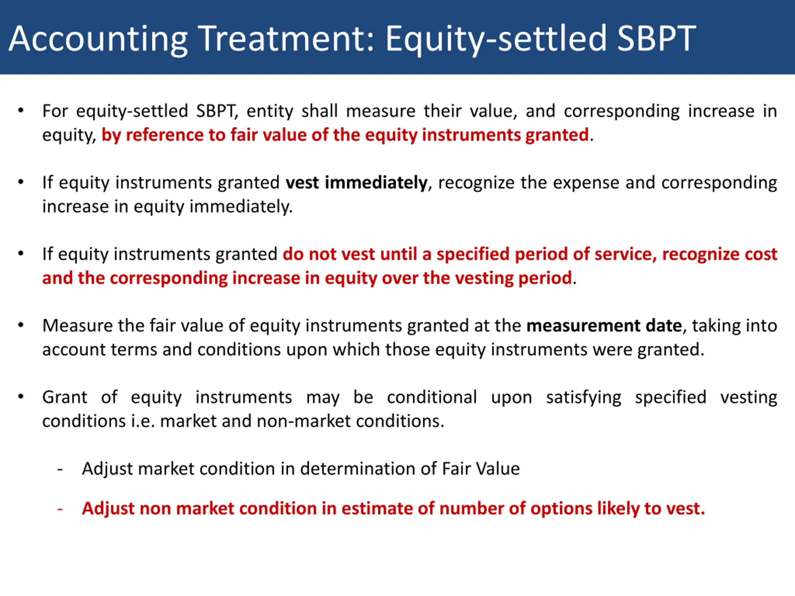 Accounting Treatment: Equity-settled SBPT For equity-settled SBPT, entity shall measure their value, and corresponding increase in equity, by reference to fair value of the equity instruments granted. If equity instruments granted vest immediately, recognize the expense and corresponding increase in equity immediately. If equity instruments granted do not vest until a specified period of service, recognize cost and the corresponding increase in equity over the vesting period. Measure the fair value of equity instruments granted at the measurement date, taking into account terms and conditions upon which those equity instruments were granted. Grant of equity instruments may be conditional upon satisfying specified vesting conditions i.e. market and non-market conditions. - Adjust market condition in determination of Fair Value - Adjust non market condition in estimate of number of options likely to vest.