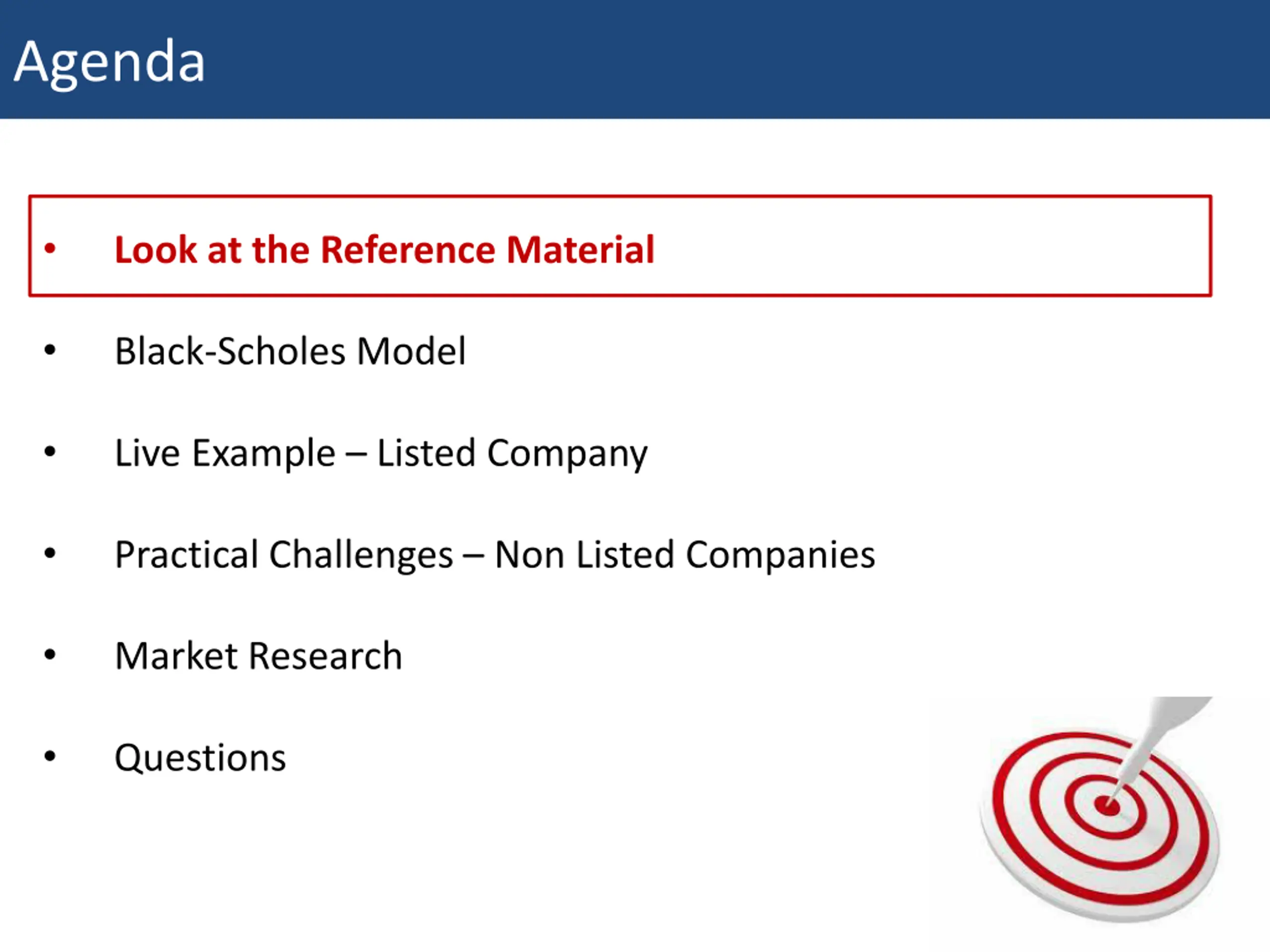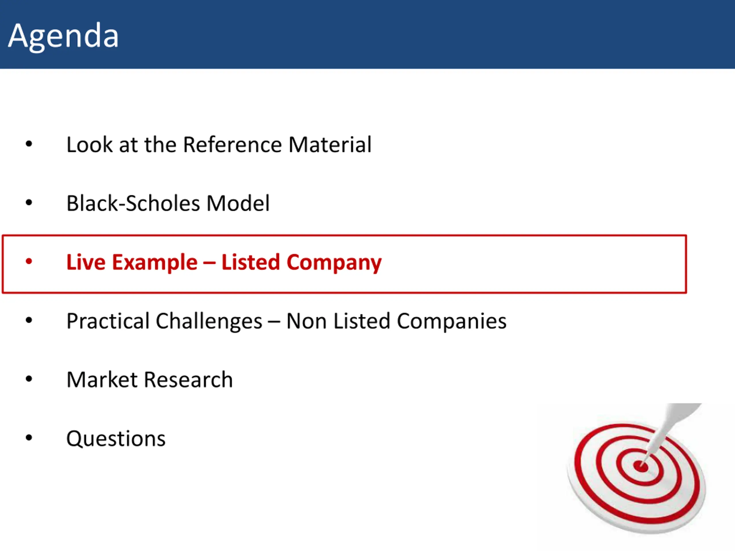 Agenda Look at the Reference Material Black-Scholes Model Live Example Listed Company Practical Challenges Non Listed Companies Market Research Questions