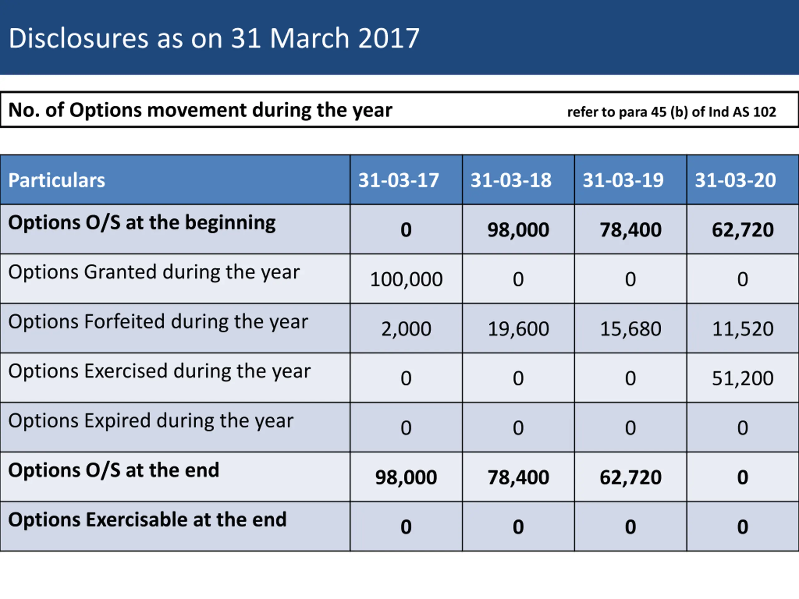 Disclosures as on 31 March 2017 No. of Options movement during the year refer to para 45 (b) of Ind AS 102 Particulars 31-03-17 31-03-18 31-03-19 31-03-20 Options O/S at the beginning 0 98,000 78,400 62,720 Options Granted during the year 100,000 0 0 0 Options Forfeited during the year 2,000 19,600 15,680 11,520 Options Exercised during the year 0 0 0 51,200 Options Expired during the year 0 0 0 0 Options O/S at the end 98,000 78,400 62,720 0 Options Exercisable at the end 0 0 0 0
