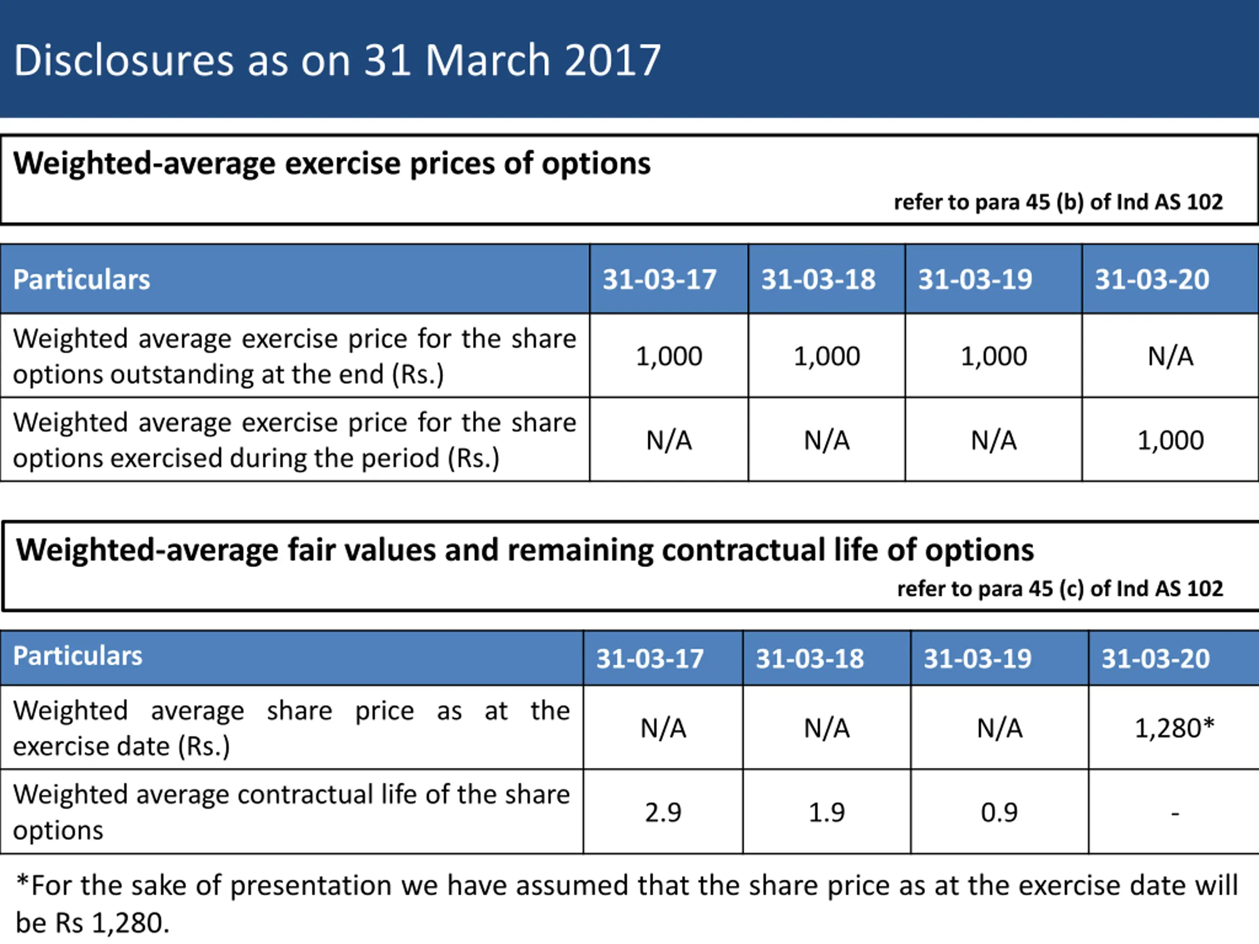 Disclosures as on 31 March 2017 Weighted-average exercise prices of options refer to para 45 (b) of Ind AS 102 Particulars 31-03-17 31-03-18 31-03-19 31-03-20 Weighted average exercise price for the share options outstanding at the end (Rs.) 1,000 1,000 1,000 N/A Weighted average exercise price for the share options exercised during the period (Rs.) N/A N/A N/A 1,000 Weighted-average fair values and remaining contractual life of options refer to para 45 (c) of Ind AS 102 Particulars 31-03-17 31-03-18 31-03-19 31-03-20 Weighted average share price as at the exercise date (Rs.) N/A N/A N/A 1,280* Weighted average contractual life of the share options 2.9 1.9 0.9 - *For the sake of presentation we have assumed that the share price as at the exercise date will be Rs 1,280.