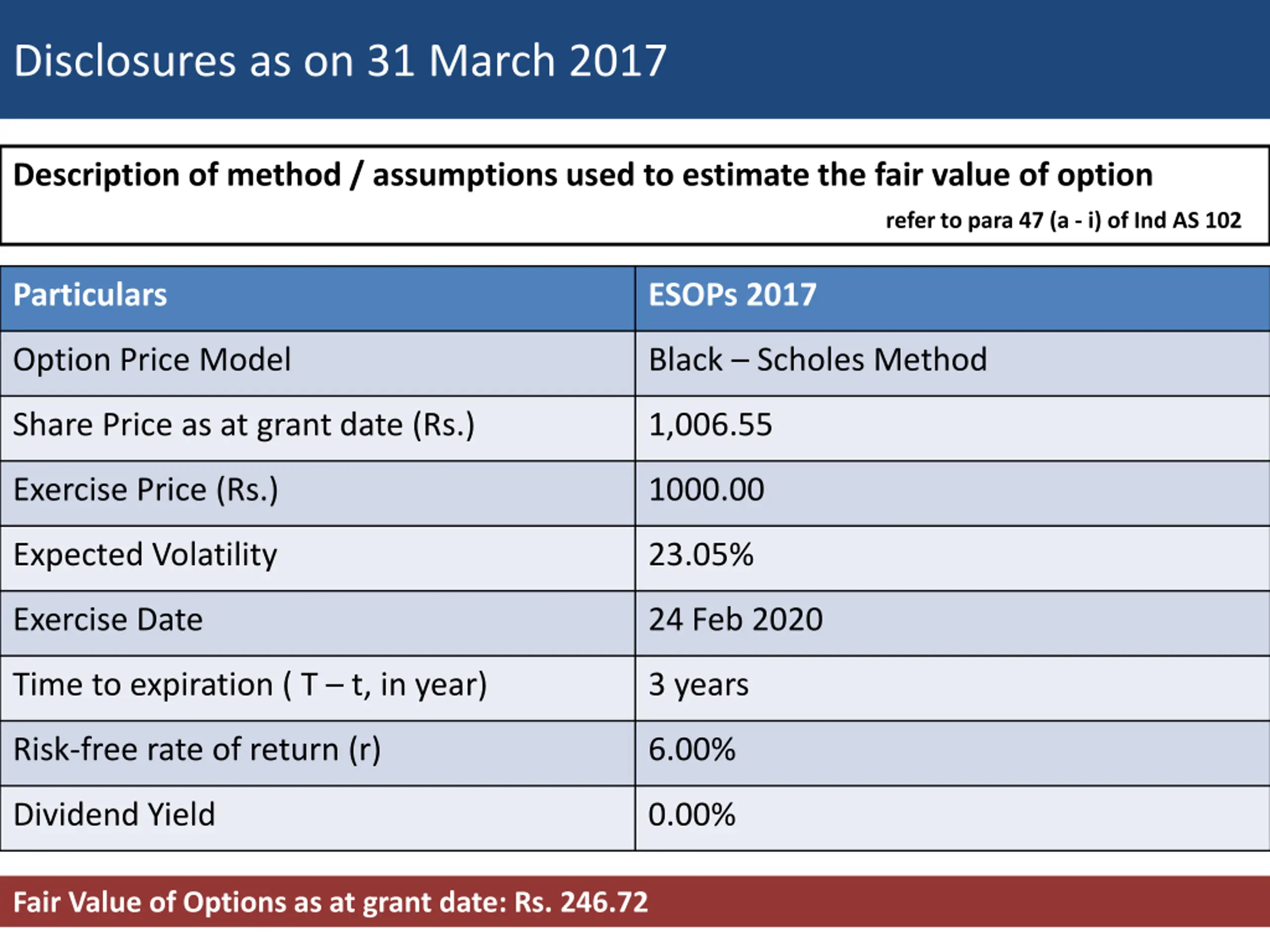 Disclosures as on 31 March 2017 Description of method / assumptions used to estimate the fair value of option refer to para 47 (a - i) of Ind AS 102 Particulars ESOPs 2017 Option Price Model Black Scholes Method Share Price as at grant date (Rs.) 1,006.55 Exercise Price (Rs.) 1000.00 Expected Volatility 23.05% Exercise Date 24 Feb 2020 Time to expiration ( T t, in year) 3 years Risk-free rate of return (r) 6.00% Dividend Yield 0.00% Fair Value of Options as at grant date: Rs. 246.72