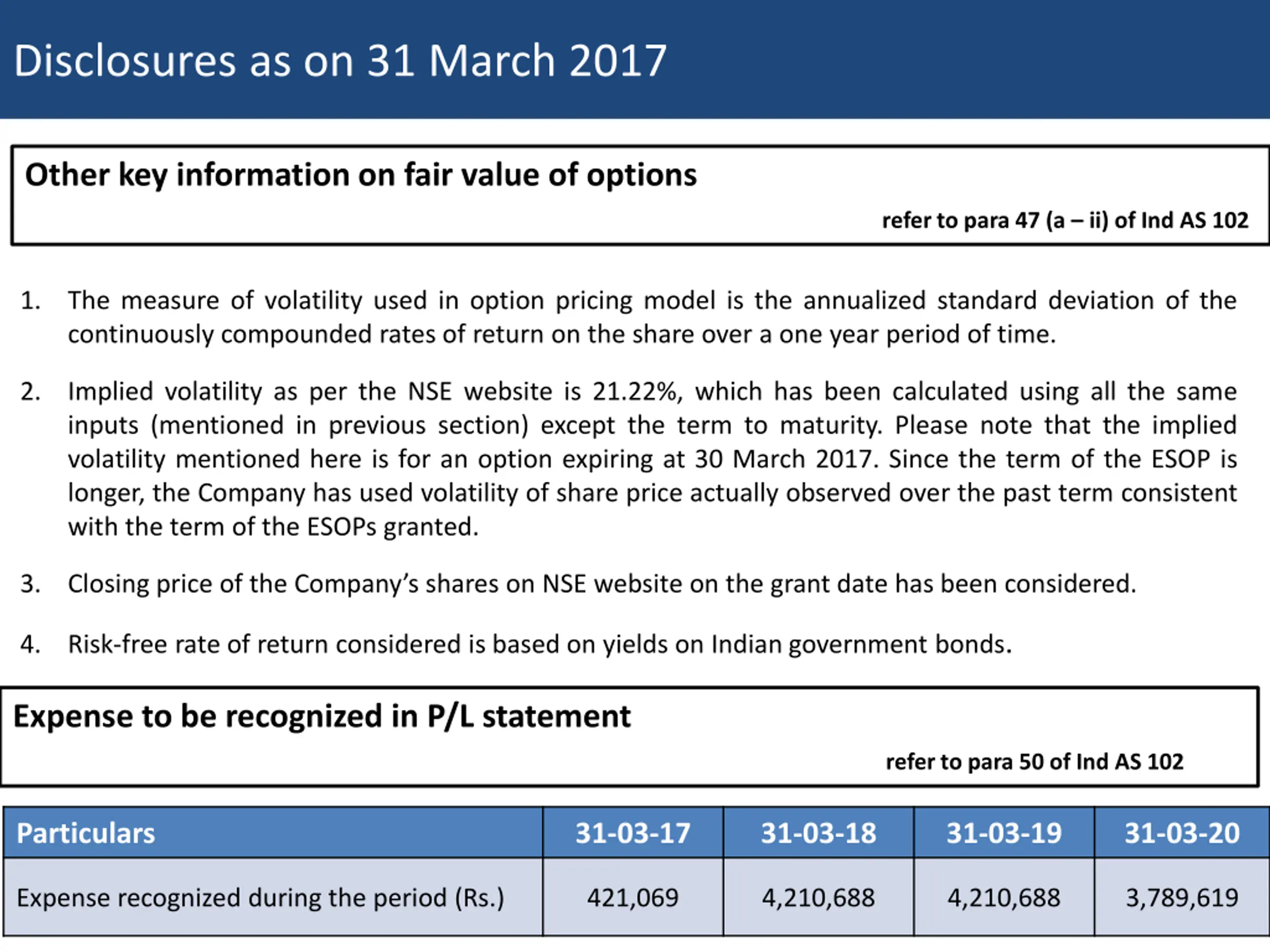 Disclosures as on 31 March 2017 Other key information on fair value of options refer to para 47 (a ii) of Ind AS 102 1. The measure of volatility used in option pricing model is the annualized standard deviation of the continuously compounded rates of return on the share over a one year period of time. 2. Implied volatility as per the NSE website is 21.22%, which has been calculated using all the same inputs (mentioned in previous section) except the term to maturity. Please note that the implied volatility mentioned here is for an option expiring at 30 March 2017. Since the term of the ESOP is longer, the Company has used volatility of share price actually observed over the past term consistent with the term of the ESOPs granted. 3. Closing price of the Company s shares on NSE website on the grant date has been considered. Risk-free rate of return considered is based on yields on Indian government bonds. 4. Expense to be recognized in P/L statement refer to para 50 of Ind AS 102 Particulars 31-03-17 31-03-18 31-03-19 31-03-20 Expense recognized during the period (Rs.) 421,069 4,210,688 4,210,688 3,789,619
