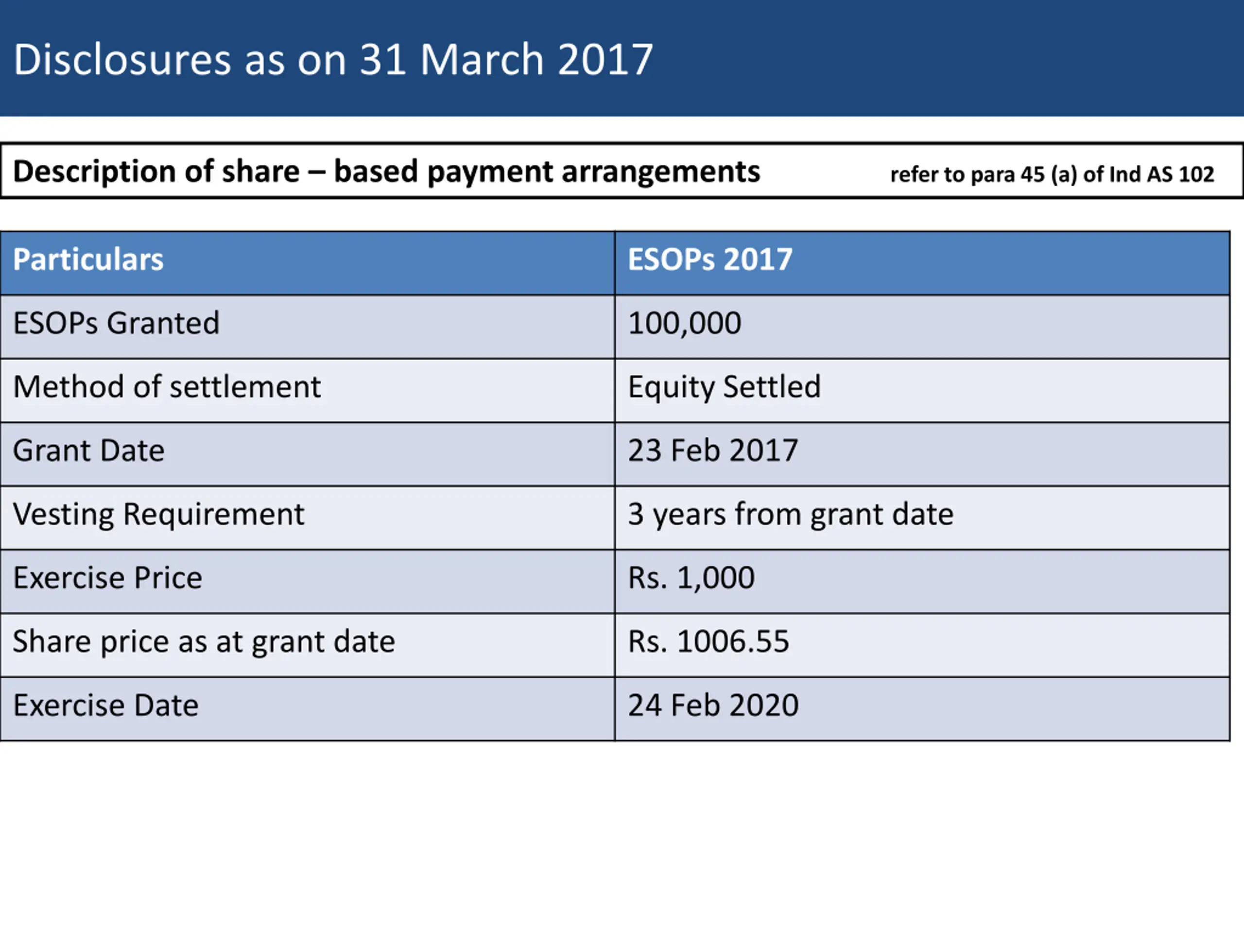 Disclosures as on 31 March 2017 Description of share based payment arrangements refer to para 45 (a) of Ind AS 102 Particulars ESOPs 2017 ESOPs Granted 100,000 Method of settlement Equity Settled Grant Date 23 Feb 2017 Vesting Requirement 3 years from grant date Exercise Price Rs. 1,000 Share price as at grant date Rs. 1006.55 Exercise Date 24 Feb 2020