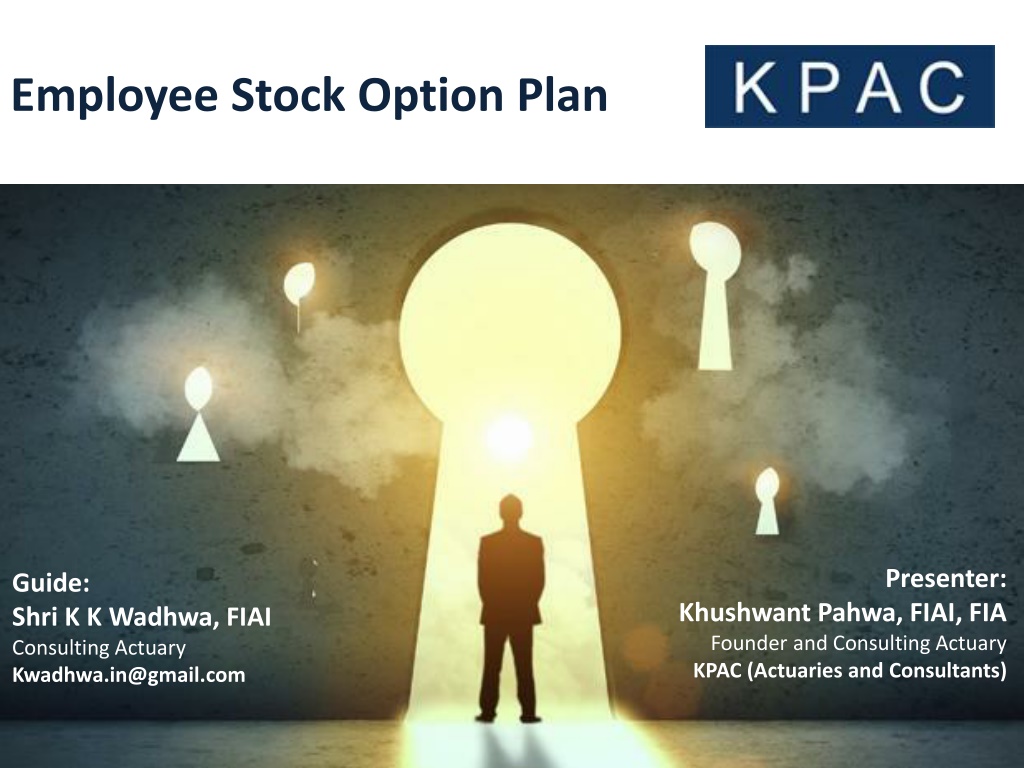 Employee Stock Option Plan Presenter: Guide: Shri K K Wadhwa, FIAI Consulting Actuary Kwadhwa.in@gmail.com Khushwant Pahwa, FIAI, FIA Founder and Consulting Actuary KPAC (Actuaries and Consultants)