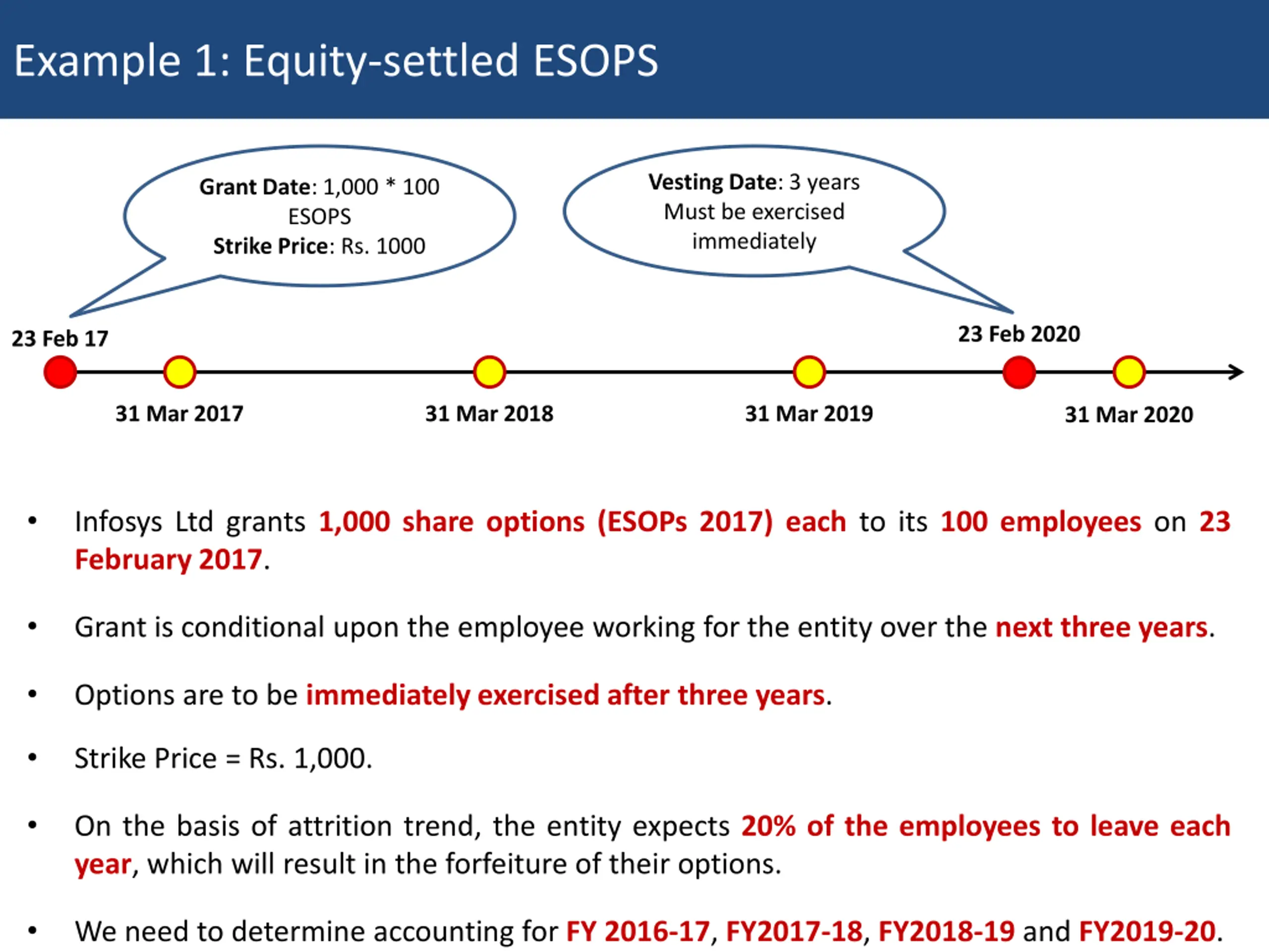 Example 1: Equity-settled ESOPS Vesting Date: 3 years Must be exercised immediately Grant Date: 1,000 * 100 ESOPS Strike Price: Rs. 1000 23 Feb 2020 23 Feb 17 31 Mar 2017 31 Mar 2018 31 Mar 2019 31 Mar 2020 Infosys Ltd grants 1,000 share options (ESOPs 2017) each to its 100 employees on 23 February 2017. Grant is conditional upon the employee working for the entity over the next three years. Options are to be immediately exercised after three years. Strike Price = Rs. 1,000. On the basis of attrition trend, the entity expects 20% of the employees to leave each year, which will result in the forfeiture of their options. We need to determine accounting for FY 2016-17, FY2017-18, FY2018-19 and FY2019-20.