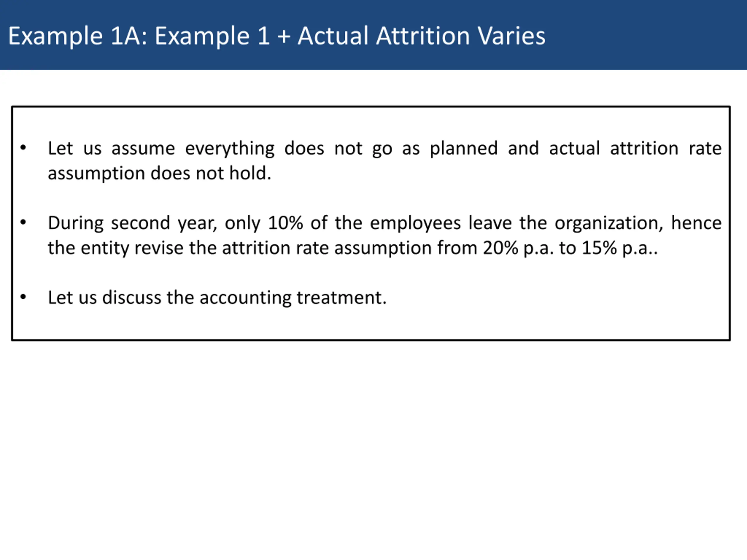 Example 1A: Example 1 + Actual Attrition Varies Let us assume everything does not go as planned and actual attrition rate assumption does not hold. During second year, only 10% of the employees leave the organization, hence the entity revise the attrition rate assumption from 20% p.a. to 15% p.a.. Let us discuss the accounting treatment.