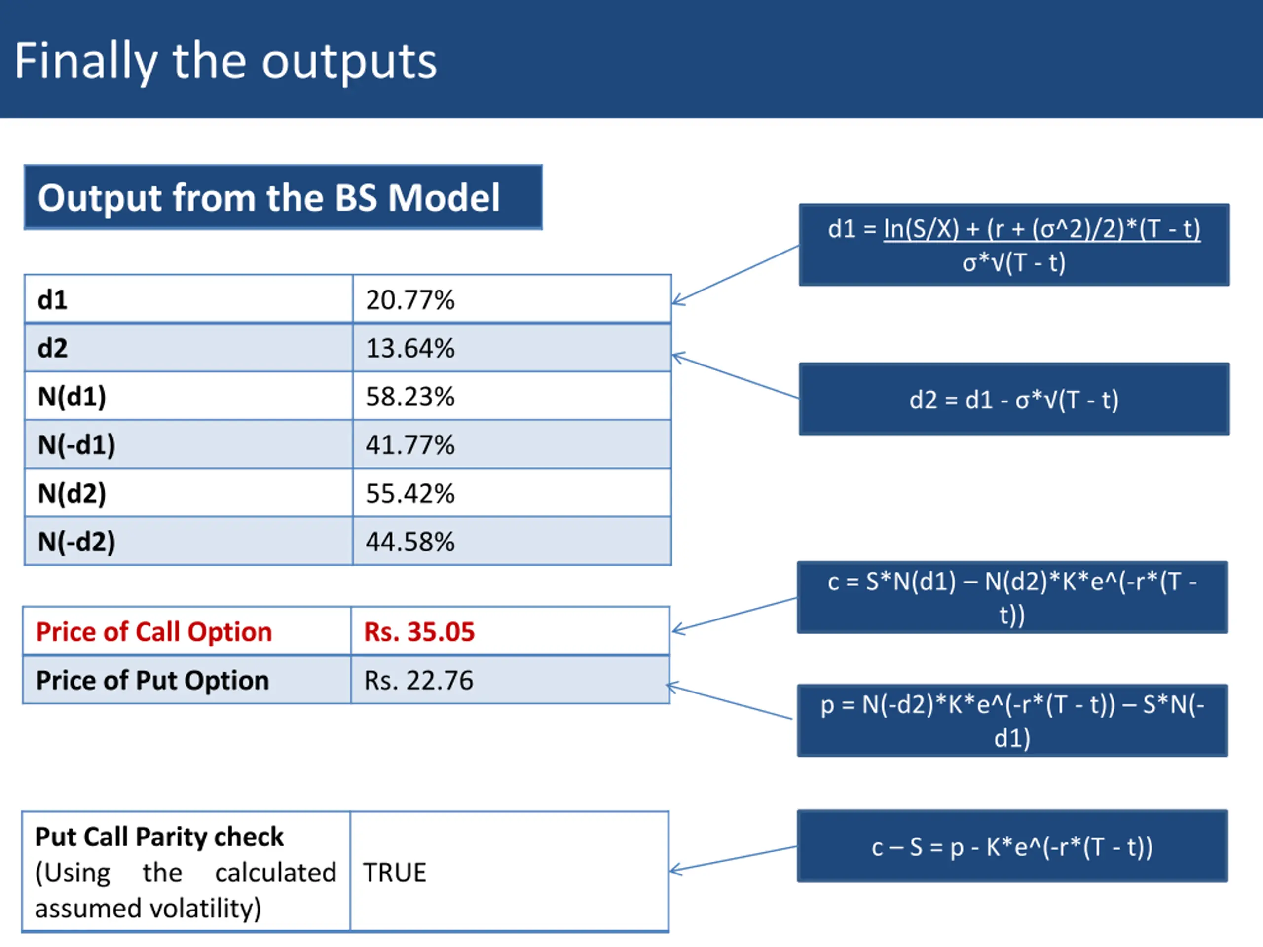 Finally the outputs Output from the BS Model d1 = ln(S/X) + (r + ( ^2)/2)*(T - t) * (T - t) d1 20.77% d2 13.64% N(d1) 58.23% d2 = d1 - * (T - t) N(-d1) 41.77% N(d2) 55.42% N(-d2) 44.58% c = S*N(d1) N(d2)*K*e^(-r*(T - t)) Price of Call Option Rs. 35.05 Price of Put Option Rs. 22.76 p = N(-d2)*K*e^(-r*(T - t)) S*N(- d1) Put Call Parity check (Using the calculated assumed volatility) c S = p - K*e^(-r*(T - t)) TRUE