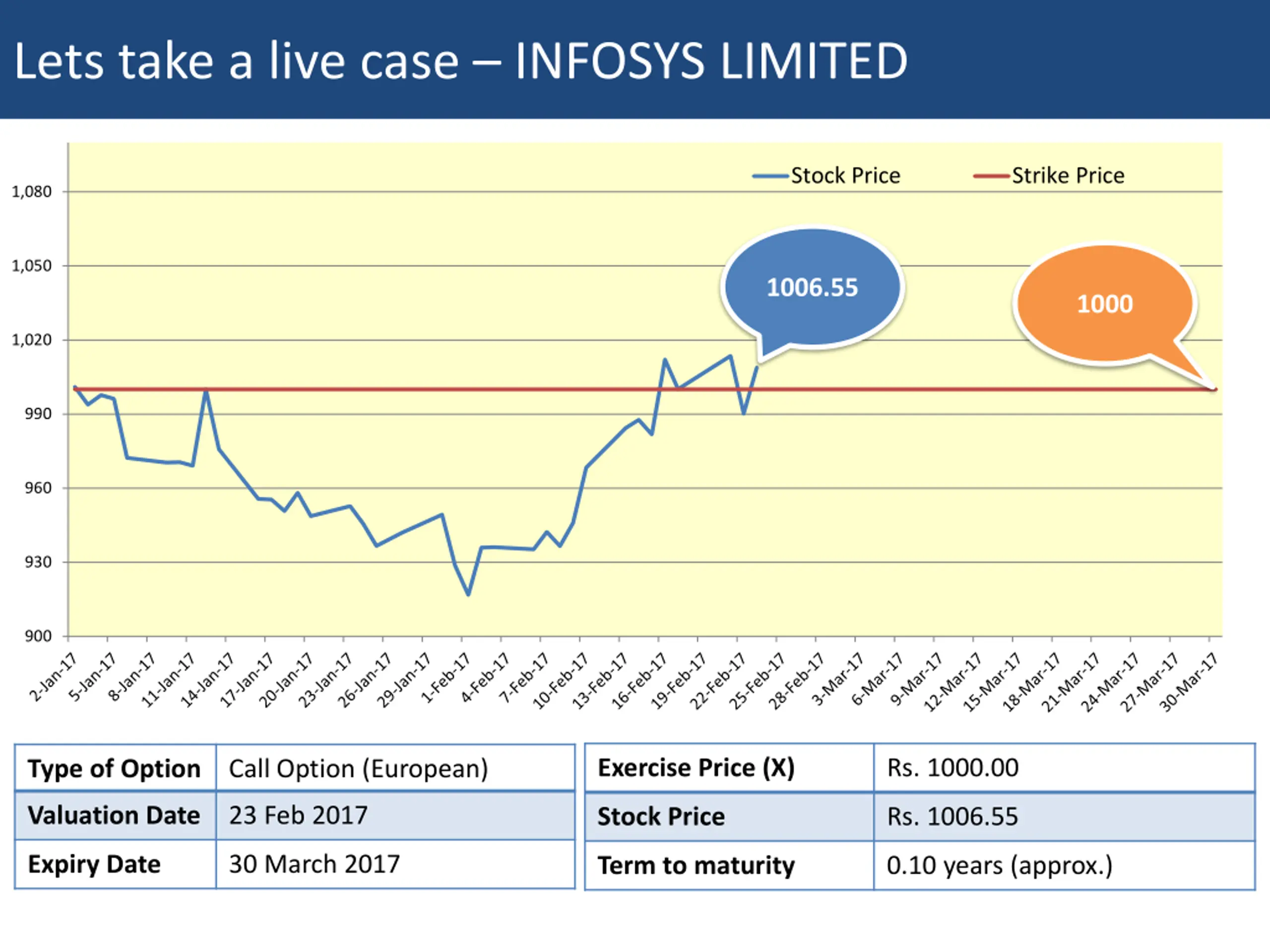 Lets take a live case INFOSYS LIMITED Stock Price Strike Price 1,080 1,050 1006.55 1000 1,020 990 960 930 900 Exercise Price (X) Rs. 1000.00 Type of Option Call Option (European) Valuation Date 23 Feb 2017 Stock Price Rs. 1006.55 Expiry Date 30 March 2017 Term to maturity 0.10 years (approx.)