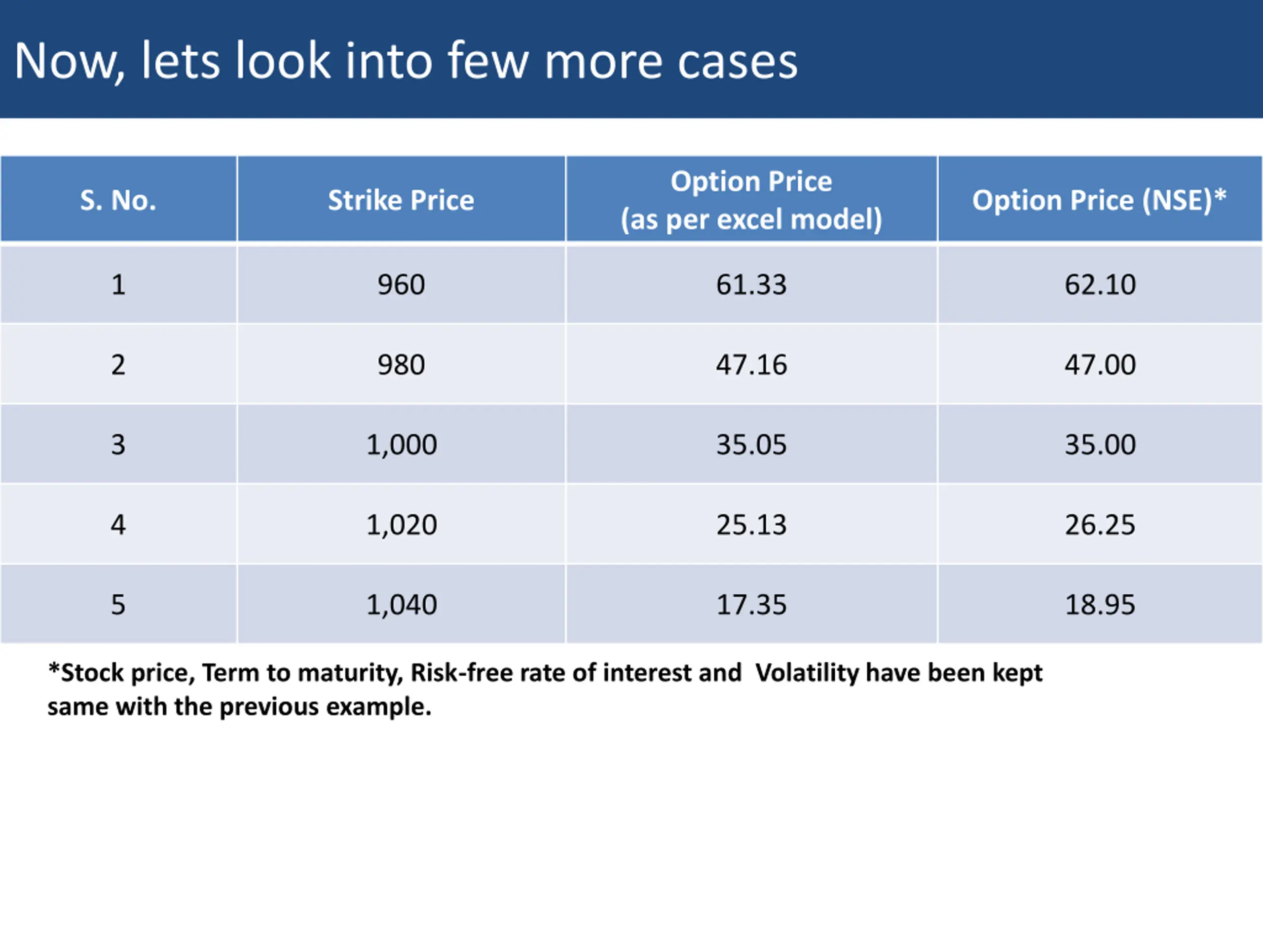 Now, lets look into few more cases Option Price (as per excel model) S. No. Strike Price Option Price (NSE)* 1 960 61.33 62.10 2 980 47.16 47.00 3 1,000 35.05 35.00 4 1,020 25.13 26.25 5 1,040 17.35 18.95 *Stock price, Term to maturity, Risk-free rate of interest and Volatility have been kept same with the previous example.
