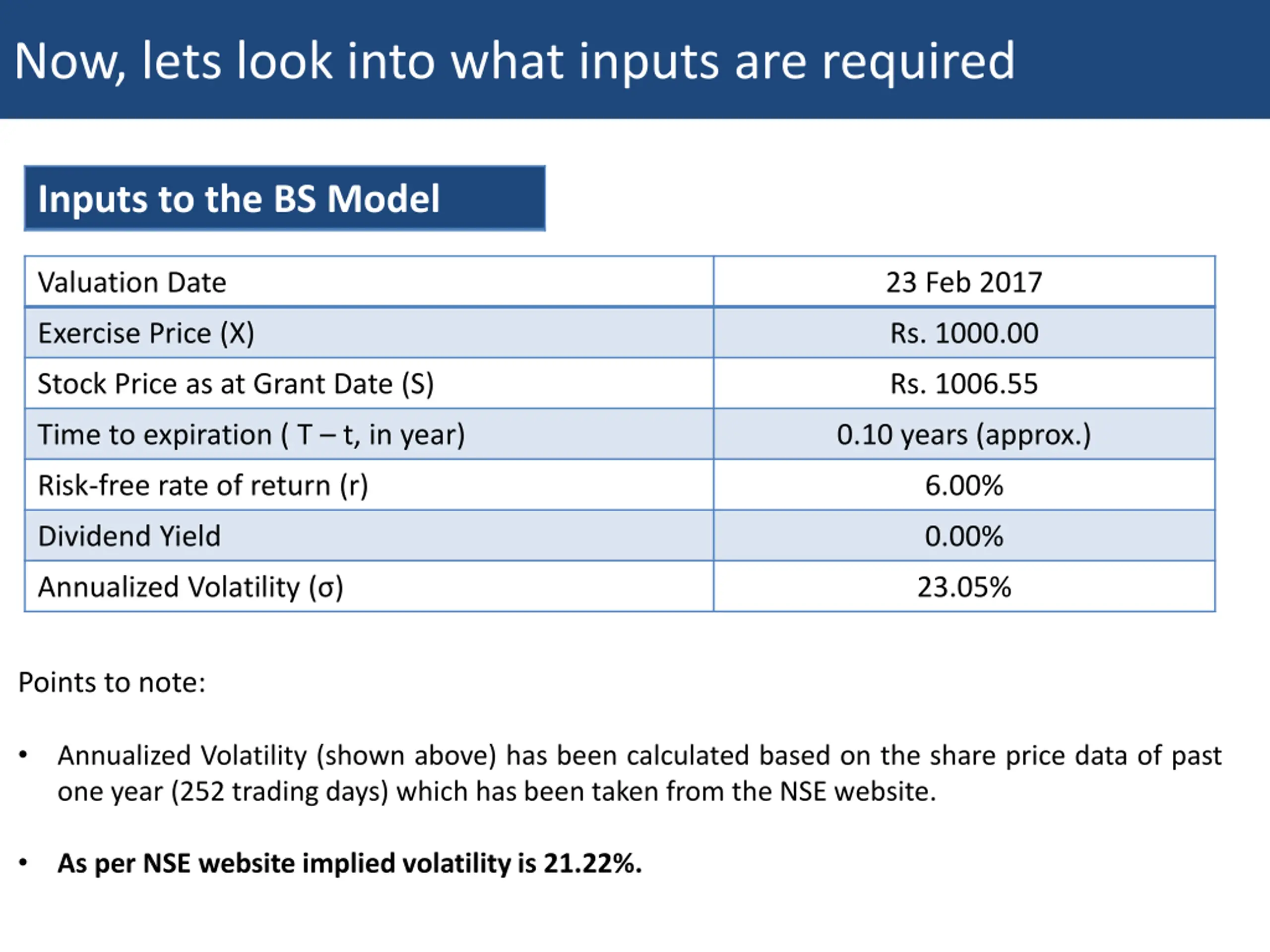 Now, lets look into what inputs are required Inputs to the BS Model Valuation Date 23 Feb 2017 Exercise Price (X) Rs. 1000.00 Stock Price as at Grant Date (S) Rs. 1006.55 Time to expiration ( T t, in year) 0.10 years (approx.) Risk-free rate of return (r) 6.00% Dividend Yield 0.00% Annualized Volatility ( ) 23.05% Points to note: Annualized Volatility (shown above) has been calculated based on the share price data of past one year (252 trading days) which has been taken from the NSE website. As per NSE website implied volatility is 21.22%.