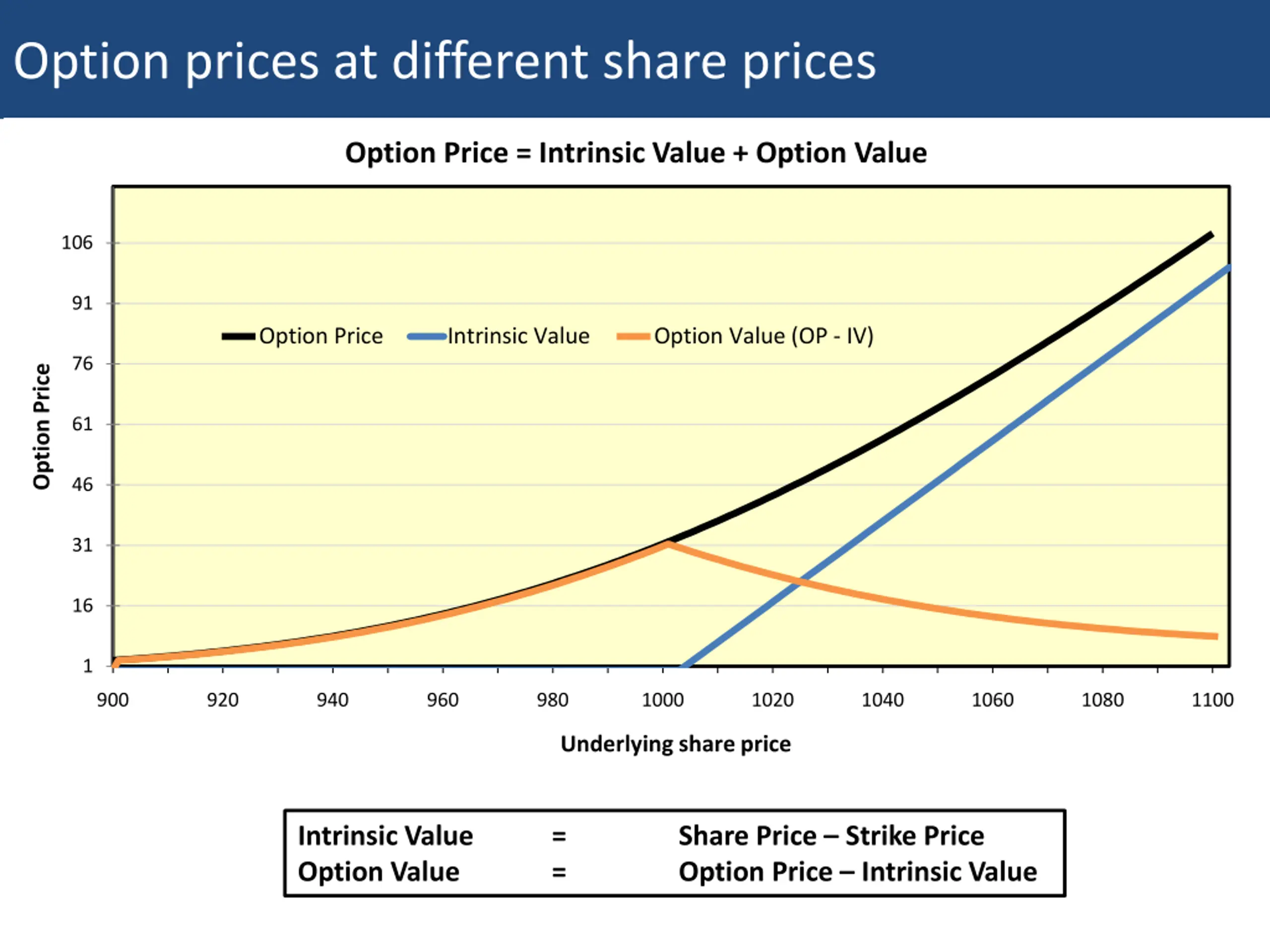 Option prices at different share prices Option Price = Intrinsic Value + Option Value 106 91 Option Price Intrinsic Value Option Value (OP - IV) 76 Option Price 61 46 31 16 1 900 920 940 960 980 1000 1020 1040 1060 1080 1100 Underlying share price Intrinsic Value Option Value = = Share Price Strike Price Option Price Intrinsic Value