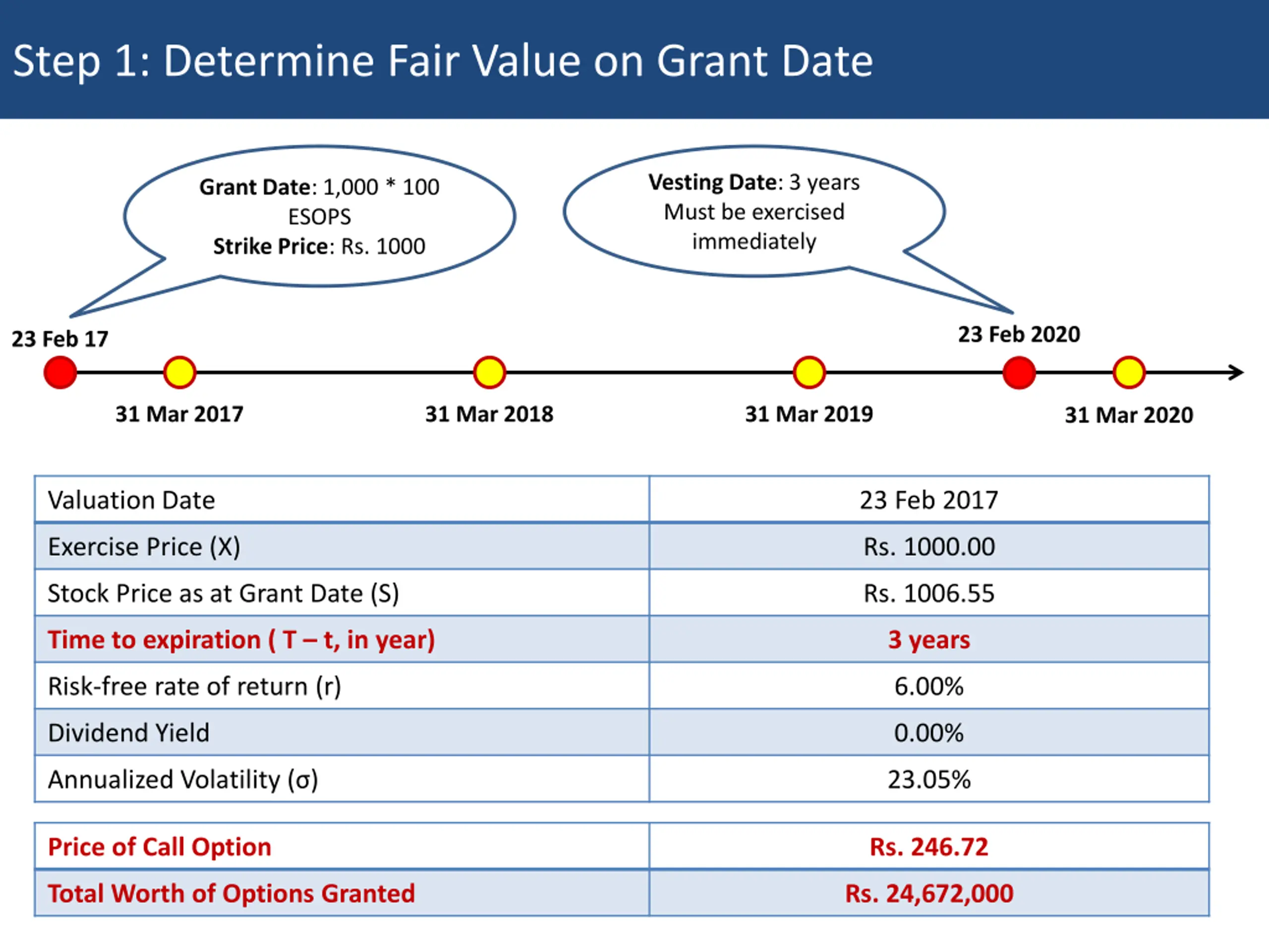 Step 1: Determine Fair Value on Grant Date Vesting Date: 3 years Must be exercised immediately Grant Date: 1,000 * 100 ESOPS Strike Price: Rs. 1000 23 Feb 2020 23 Feb 17 31 Mar 2017 31 Mar 2018 31 Mar 2019 31 Mar 2020 Valuation Date 23 Feb 2017 Exercise Price (X) Rs. 1000.00 Stock Price as at Grant Date (S) Rs. 1006.55 Time to expiration ( T t, in year) 3 years Risk-free rate of return (r) 6.00% Dividend Yield 0.00% Annualized Volatility ( ) 23.05% Price of Call Option Rs. 246.72 Total Worth of Options Granted Rs. 24,672,000