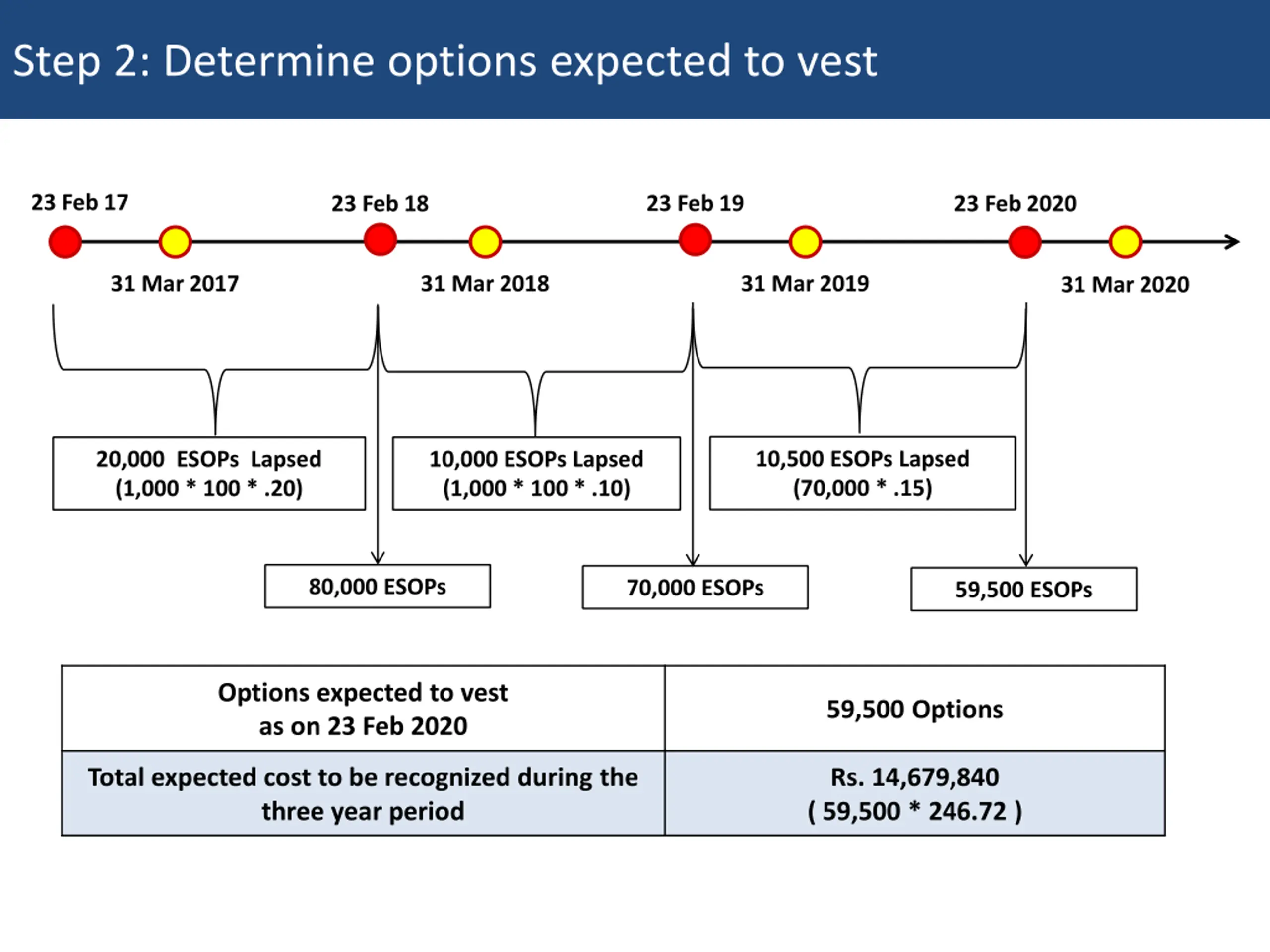 Step 2: Determine options expected to vest 23 Feb 17 23 Feb 19 23 Feb 18 23 Feb 2020 31 Mar 2017 31 Mar 2018 31 Mar 2019 31 Mar 2020 10,500 ESOPs Lapsed (70,000 * .15) 20,000 ESOPs Lapsed (1,000 * 100 * .20) 10,000 ESOPs Lapsed (1,000 * 100 * .10) 80,000 ESOPs 70,000 ESOPs 59,500 ESOPs Options expected to vest as on 23 Feb 2020 59,500 Options Total expected cost to be recognized during the three year period Rs. 14,679,840 ( 59,500 * 246.72 )