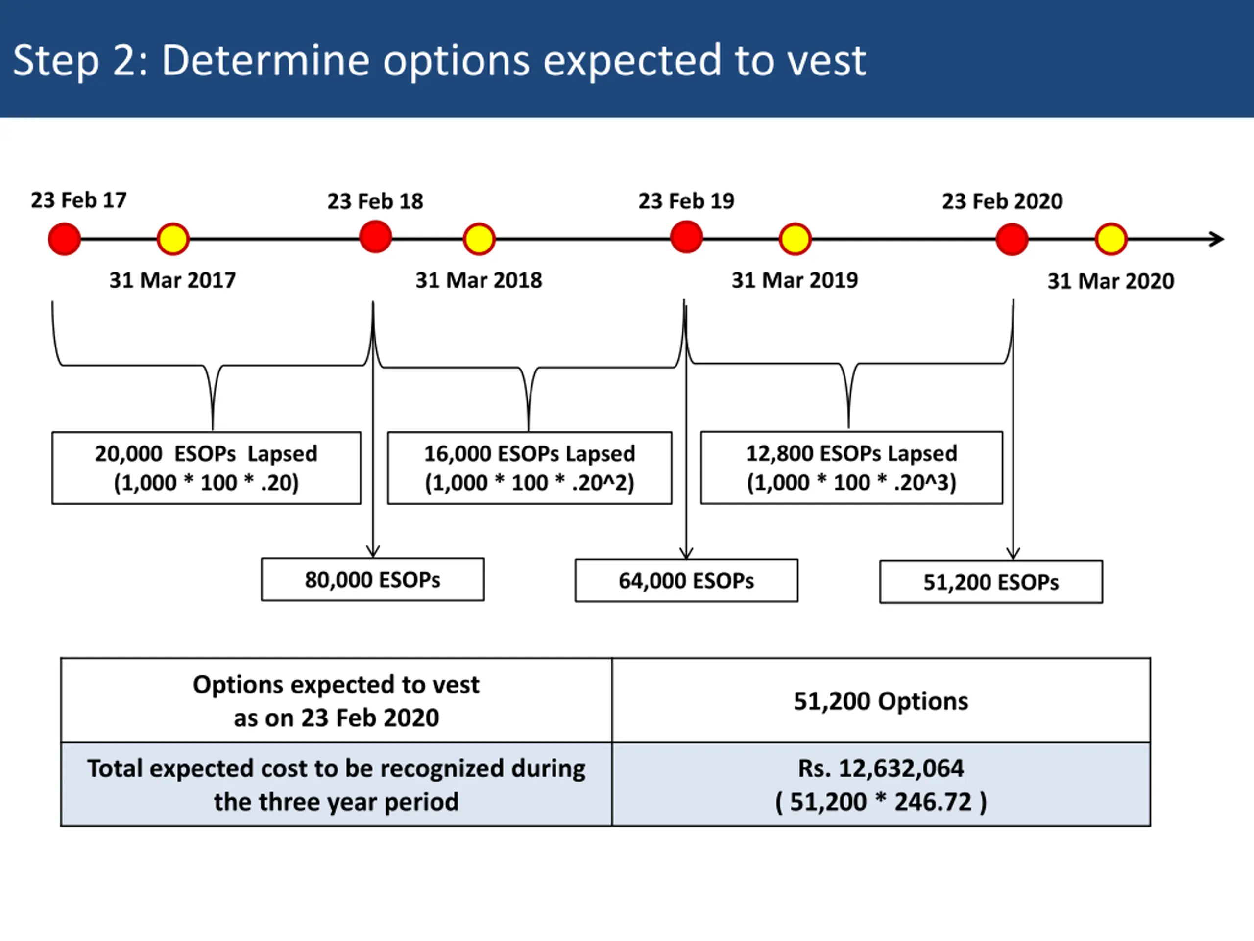 Step 2: Determine options expected to vest 23 Feb 17 23 Feb 19 23 Feb 18 23 Feb 2020 31 Mar 2017 31 Mar 2018 31 Mar 2019 31 Mar 2020 12,800 ESOPs Lapsed (1,000 * 100 * .20^3) 20,000 ESOPs Lapsed (1,000 * 100 * .20) 16,000 ESOPs Lapsed (1,000 * 100 * .20^2) 80,000 ESOPs 64,000 ESOPs 51,200 ESOPs Options expected to vest as on 23 Feb 2020 51,200 Options Total expected cost to be recognized during the three year period Rs. 12,632,064 ( 51,200 * 246.72 )