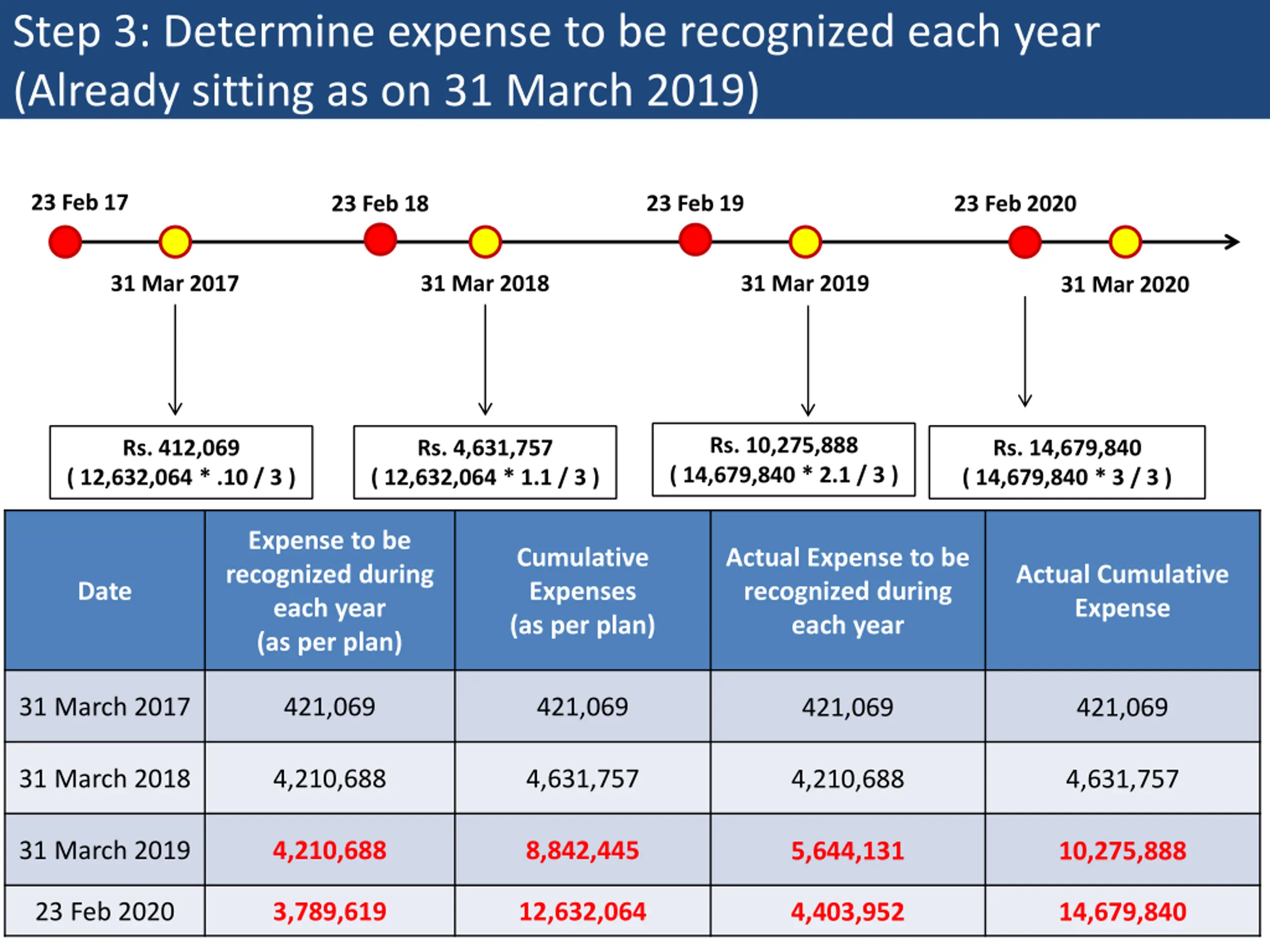 Step 3: Determine expense to be recognized each year (Already sitting as on 31 March 2019) 23 Feb 17 23 Feb 19 23 Feb 18 23 Feb 2020 31 Mar 2017 31 Mar 2018 31 Mar 2019 31 Mar 2020 Rs. 10,275,888 ( 14,679,840 * 2.1 / 3 ) Rs. 412,069 ( 12,632,064 * .10 / 3 ) Rs. 4,631,757 ( 12,632,064 * 1.1 / 3 ) Rs. 14,679,840 ( 14,679,840 * 3 / 3 ) Expense to be recognized during each year (as per plan) Cumulative Expenses (as per plan) Actual Expense to be recognized during each year Actual Cumulative Expense Date 31 March 2017 421,069 421,069 421,069 421,069 31 March 2018 4,210,688 4,631,757 4,210,688 4,631,757 31 March 2019 4,210,688 8,842,445 5,644,131 10,275,888 23 Feb 2020 3,789,619 12,632,064 4,403,952 14,679,840