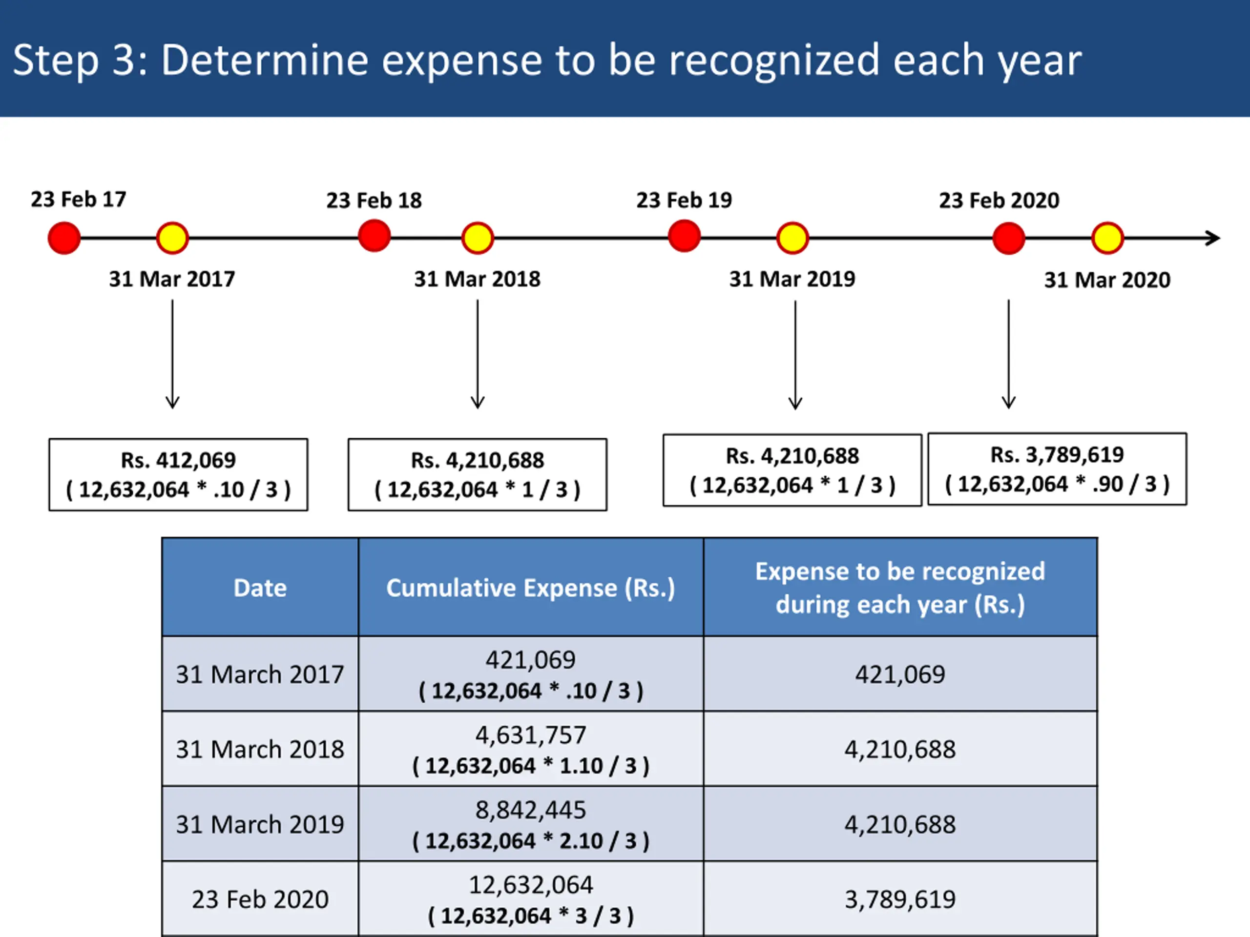 Step 3: Determine expense to be recognized each year 23 Feb 17 23 Feb 19 23 Feb 18 23 Feb 2020 31 Mar 2017 31 Mar 2018 31 Mar 2019 31 Mar 2020 Rs. 3,789,619 ( 12,632,064 * .90 / 3 ) Rs. 4,210,688 ( 12,632,064 * 1 / 3 ) Rs. 412,069 ( 12,632,064 * .10 / 3 ) Rs. 4,210,688 ( 12,632,064 * 1 / 3 ) Expense to be recognized during each year (Rs.) Date Cumulative Expense (Rs.) 421,069 31 March 2017 421,069 ( 12,632,064 * .10 / 3 ) 4,631,757 31 March 2018 4,210,688 ( 12,632,064 * 1.10 / 3 ) 8,842,445 31 March 2019 4,210,688 ( 12,632,064 * 2.10 / 3 ) 12,632,064 ( 12,632,064 * 3 / 3 ) 23 Feb 2020 3,789,619