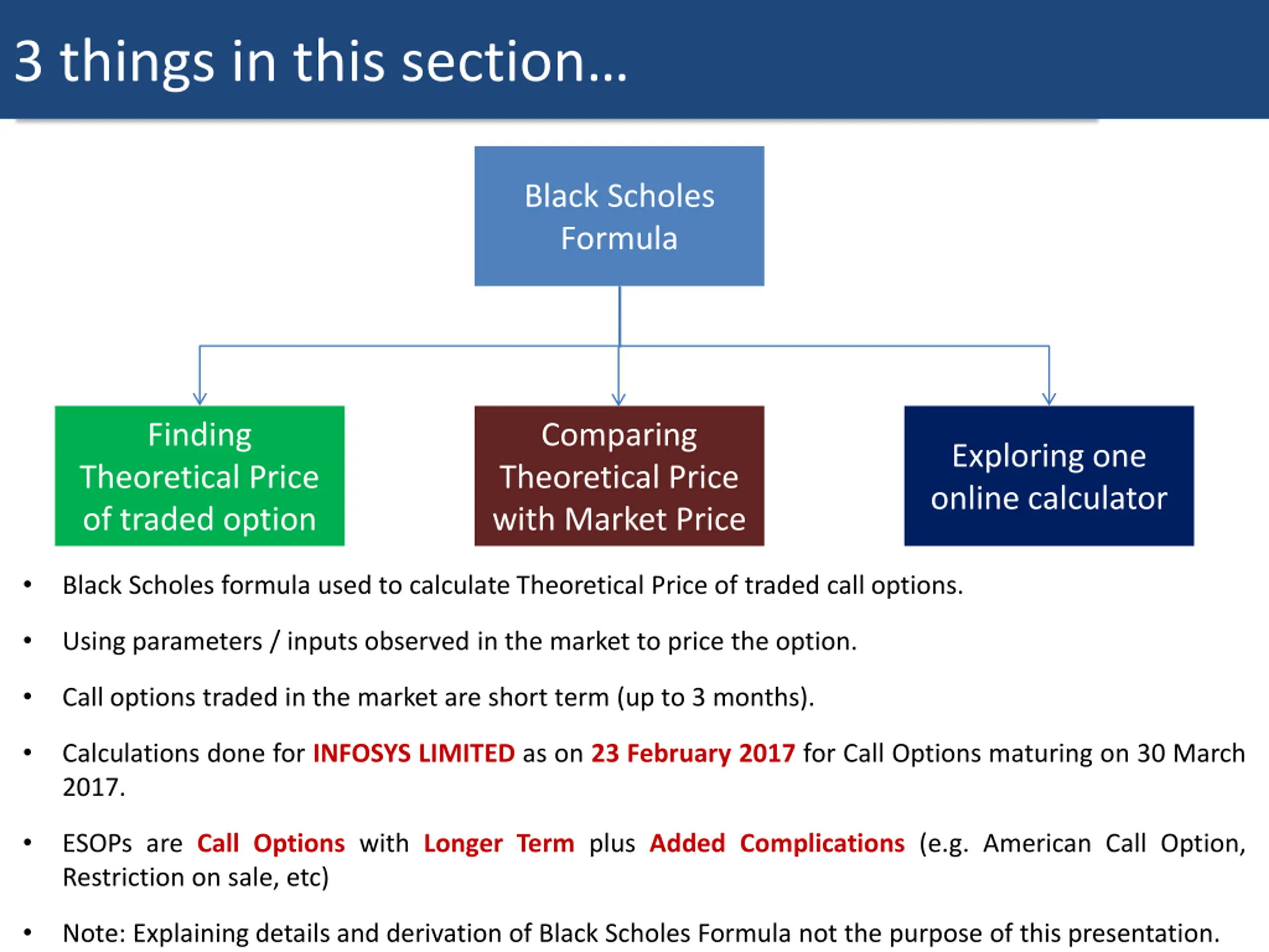 The Black Scholes Formulas 3 things in this section Black Scholes Formula Finding Comparing Theoretical Price with Market Price Exploring one online calculator Theoretical Price of traded option Black Scholes formula used to calculate Theoretical Price of traded call options. Using parameters / inputs observed in the market to price the option. Call options traded in the market are short term (up to 3 months). Calculations done for INFOSYS LIMITED as on 23 February 2017 for Call Options maturing on 30 March 2017. ESOPs are Call Options with Longer Term plus Added Complications (e.g. American Call Option, Restriction on sale, etc) Note: Explaining details and derivation of Black Scholes Formula not the purpose of this presentation.
