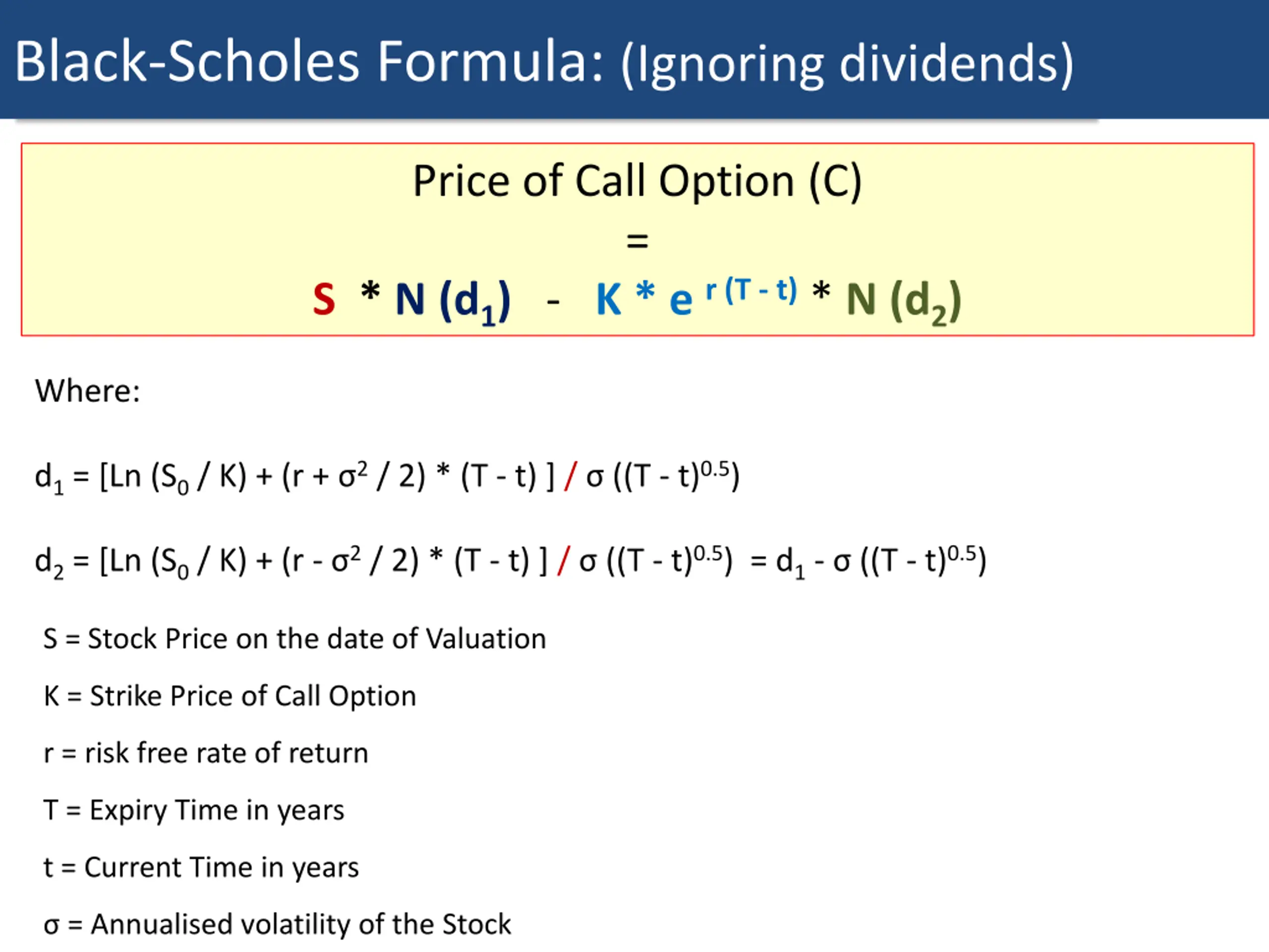 The Black Scholes Formulas Black-Scholes Formula: (Ignoring dividends) Price of Call Option (C) = S * N (d1) - K * e r (T - t) * N (d2) Where: d1 = [Ln (S0 / K) + (r + 2 / 2) * (T - t) ] / ((T - t)0.5) d2 = [Ln (S0 / K) + (r - 2 / 2) * (T - t) ] / ((T - t)0.5) = d1 - ((T - t)0.5) S = Stock Price on the date of Valuation K = Strike Price of Call Option r = risk free rate of return T = Expiry Time in years t = Current Time in years = Annualised volatility of the Stock