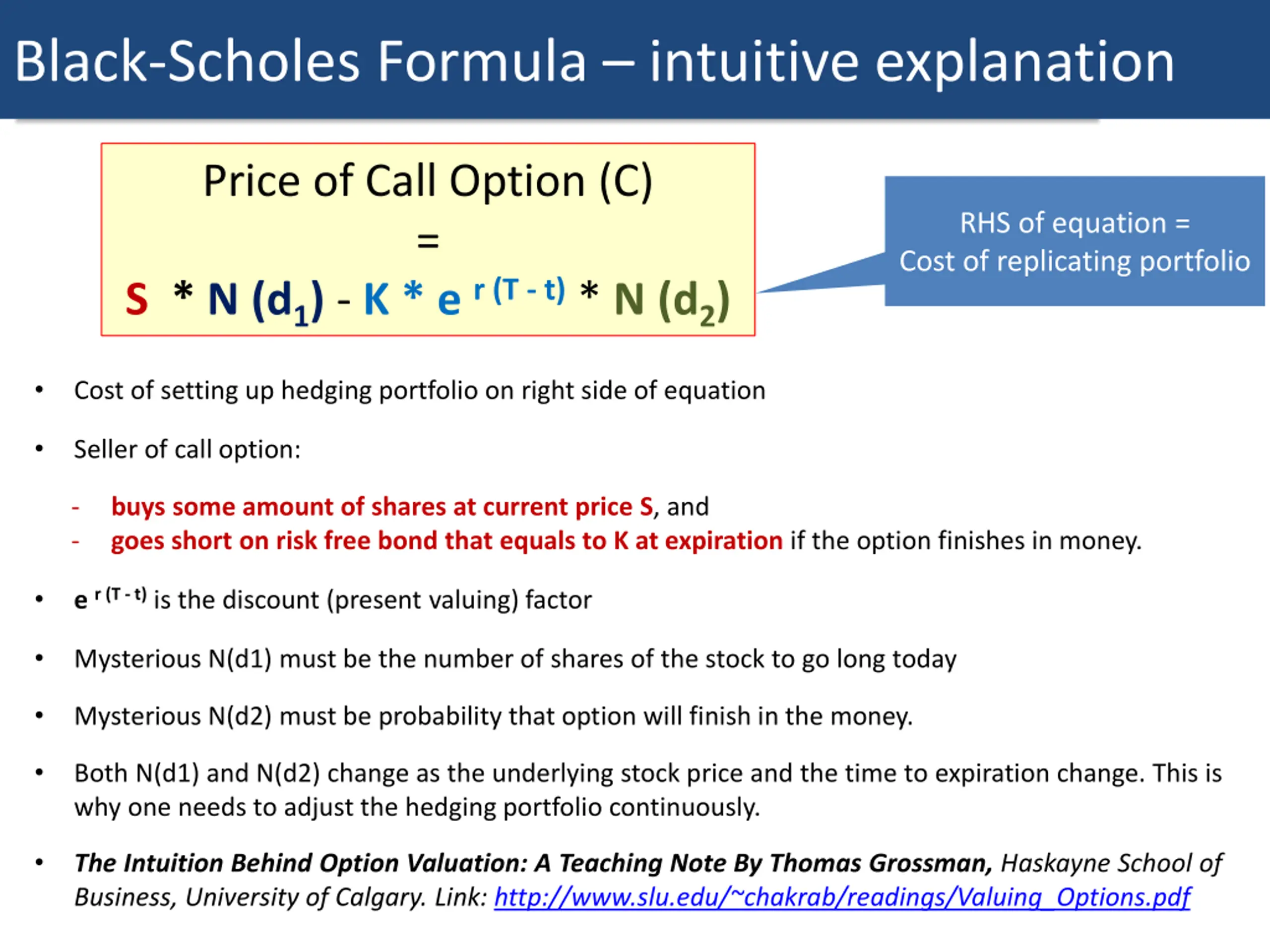 The Black Scholes Formulas Black-Scholes Formula intuitive explanation Price of Call Option (C) = S * N (d1) - K * e r (T - t) * N (d2) RHS of equation = Cost of replicating portfolio Cost of setting up hedging portfolio on right side of equation Seller of call option: - - buys some amount of shares at current price S, and goes short on risk free bond that equals to K at expiration if the option finishes in money. e r (T - t) is the discount (present valuing) factor Mysterious N(d1) must be the number of shares of the stock to go long today Mysterious N(d2) must be probability that option will finish in the money. Both N(d1) and N(d2) change as the underlying stock price and the time to expiration change. This is why one needs to adjust the hedging portfolio continuously. The Intuition Behind Option Valuation: A Teaching Note By Thomas Grossman, Haskayne School of Business, University of Calgary. Link: http://www.slu.edu/~chakrab/readings/Valuing_Options.pdf