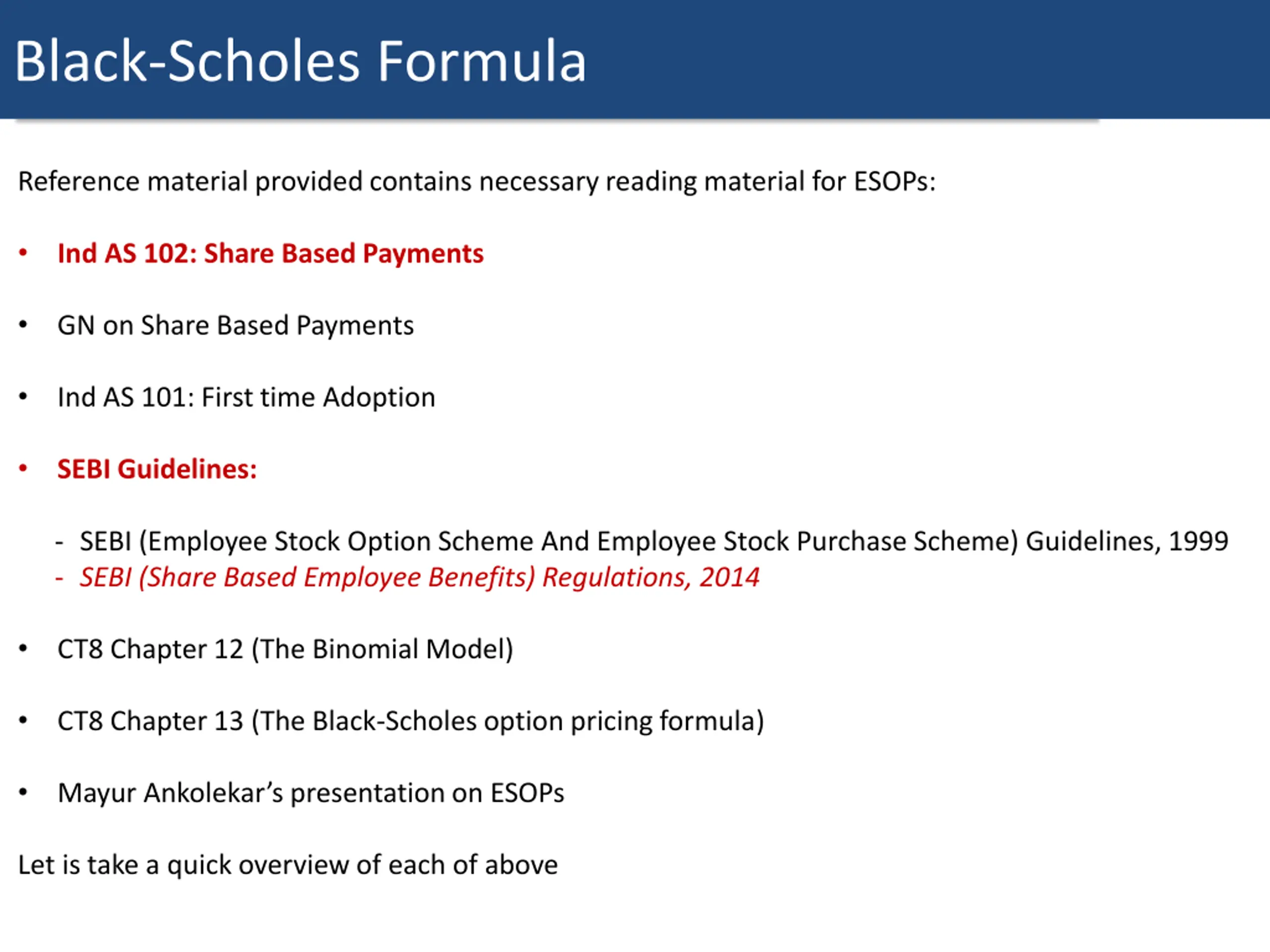 The Black Scholes Formulas Black-Scholes Formula Reference material provided contains necessary reading material for ESOPs: Ind AS 102: Share Based Payments GN on Share Based Payments Ind AS 101: First time Adoption SEBI Guidelines: - SEBI (Employee Stock Option Scheme And Employee Stock Purchase Scheme) Guidelines, 1999 - SEBI (Share Based Employee Benefits) Regulations, 2014 CT8 Chapter 12 (The Binomial Model) CT8 Chapter 13 (The Black-Scholes option pricing formula) Mayur Ankolekar s presentation on ESOPs Let is take a quick overview of each of above