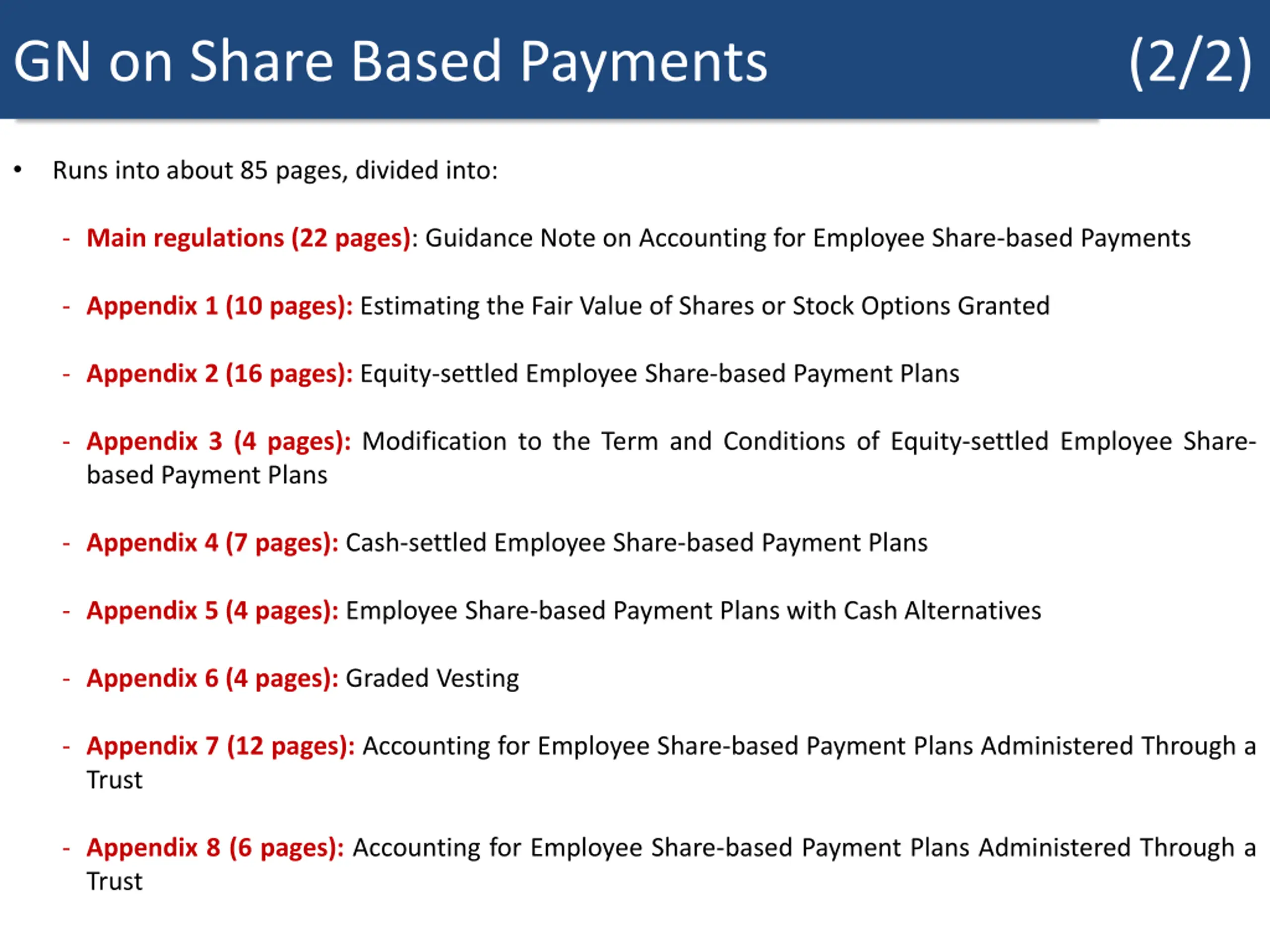 The Black Scholes Formulas GN on Share Based Payments (2/2) Runs into about 85 pages, divided into: - Main regulations (22 pages): Guidance Note on Accounting for Employee Share-based Payments - Appendix 1 (10 pages): Estimating the Fair Value of Shares or Stock Options Granted - Appendix 2 (16 pages): Equity-settled Employee Share-based Payment Plans - Appendix 3 (4 pages): Modification to the Term and Conditions of Equity-settled Employee Share- based Payment Plans - Appendix 4 (7 pages): Cash-settled Employee Share-based Payment Plans - Appendix 5 (4 pages): Employee Share-based Payment Plans with Cash Alternatives - Appendix 6 (4 pages): Graded Vesting - Appendix 7 (12 pages): Accounting for Employee Share-based Payment Plans Administered Through a Trust - Appendix 8 (6 pages): Accounting for Employee Share-based Payment Plans Administered Through a Trust