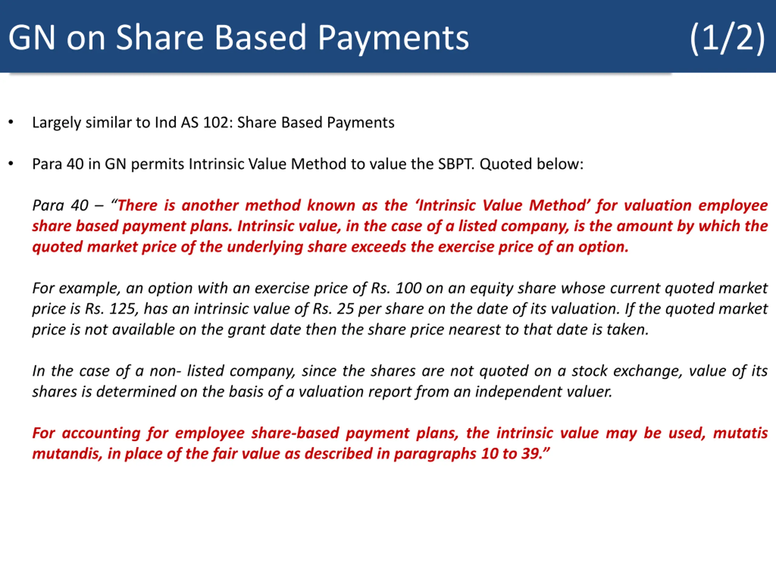 The Black Scholes Formulas GN on Share Based Payments (1/2) Largely similar to Ind AS 102: Share Based Payments Para 40 in GN permits Intrinsic Value Method to value the SBPT. Quoted below: Para 40 There is another method known as the Intrinsic Value Method for valuation employee share based payment plans. Intrinsic value, in the case of a listed company, is the amount by which the quoted market price of the underlying share exceeds the exercise price of an option. For example, an option with an exercise price of Rs. 100 on an equity share whose current quoted market price is Rs. 125, has an intrinsic value of Rs. 25 per share on the date of its valuation. If the quoted market price is not available on the grant date then the share price nearest to that date is taken. In the case of a non- listed company, since the shares are not quoted on a stock exchange, value of its shares is determined on the basis of a valuation report from an independent valuer. For accounting for employee share-based payment plans, the intrinsic value may be used, mutatis mutandis, in place of the fair value as described in paragraphs 10 to 39.