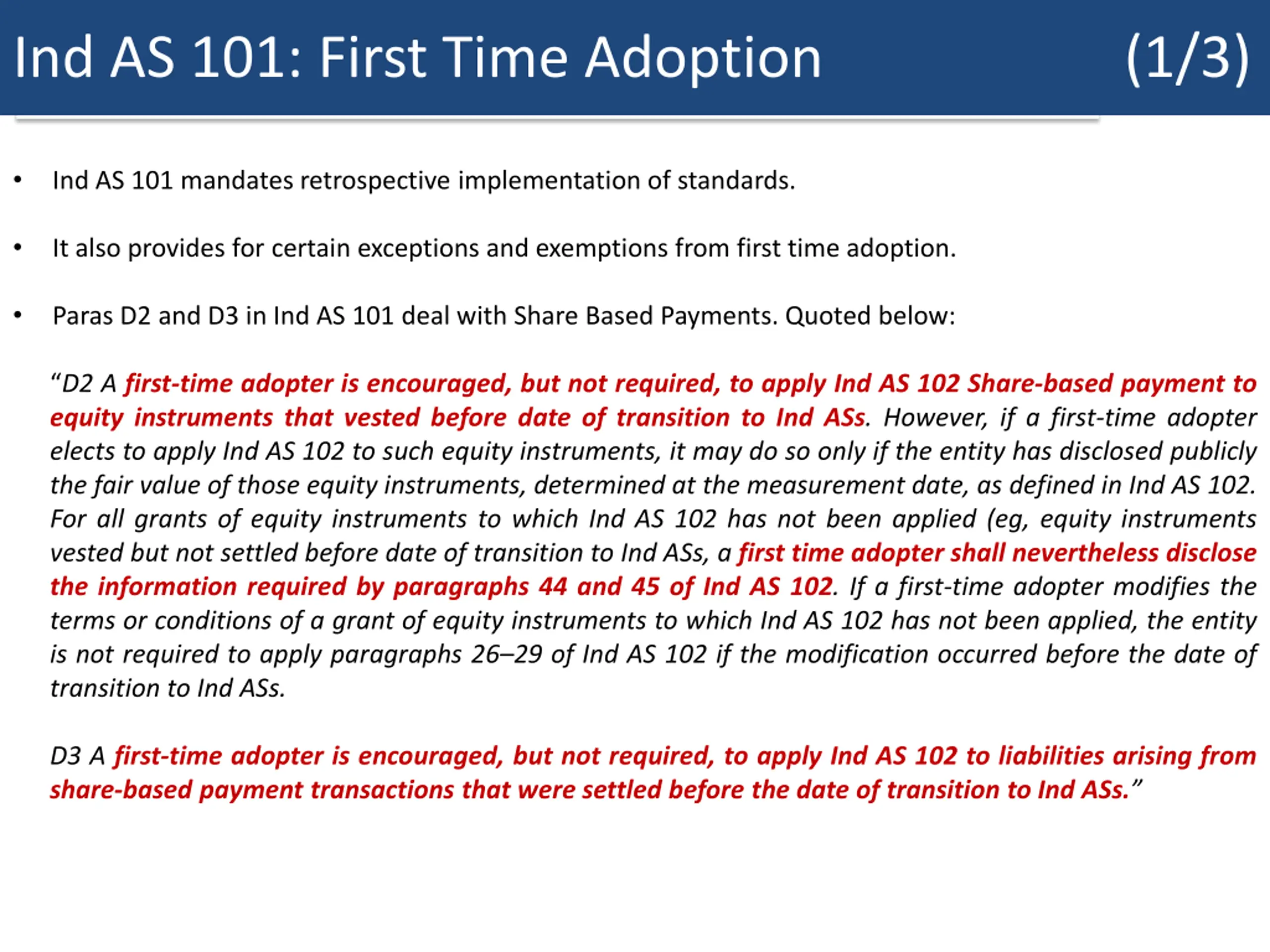 The Black Scholes Formulas Ind AS 101: First Time Adoption (1/3) Ind AS 101 mandates retrospective implementation of standards. It also provides for certain exceptions and exemptions from first time adoption. Paras D2 and D3 in Ind AS 101 deal with Share Based Payments. Quoted below: D2 A first-time adopter is encouraged, but not required, to apply Ind AS 102 Share-based payment to equity instruments that vested before date of transition to Ind ASs. However, if a first-time adopter elects to apply Ind AS 102 to such equity instruments, it may do so only if the entity has disclosed publicly the fair value of those equity instruments, determined at the measurement date, as defined in Ind AS 102. For all grants of equity instruments to which Ind AS 102 has not been applied (eg, equity instruments vested but not settled before date of transition to Ind ASs, a first time adopter shall nevertheless disclose the information required by paragraphs 44 and 45 of Ind AS 102. If a first-time adopter modifies the terms or conditions of a grant of equity instruments to which Ind AS 102 has not been applied, the entity is not required to apply paragraphs 26 29 of Ind AS 102 if the modification occurred before the date of transition to Ind ASs. D3 A first-time adopter is encouraged, but not required, to apply Ind AS 102 to liabilities arising from share-based payment transactions that were settled before the date of transition to Ind ASs.