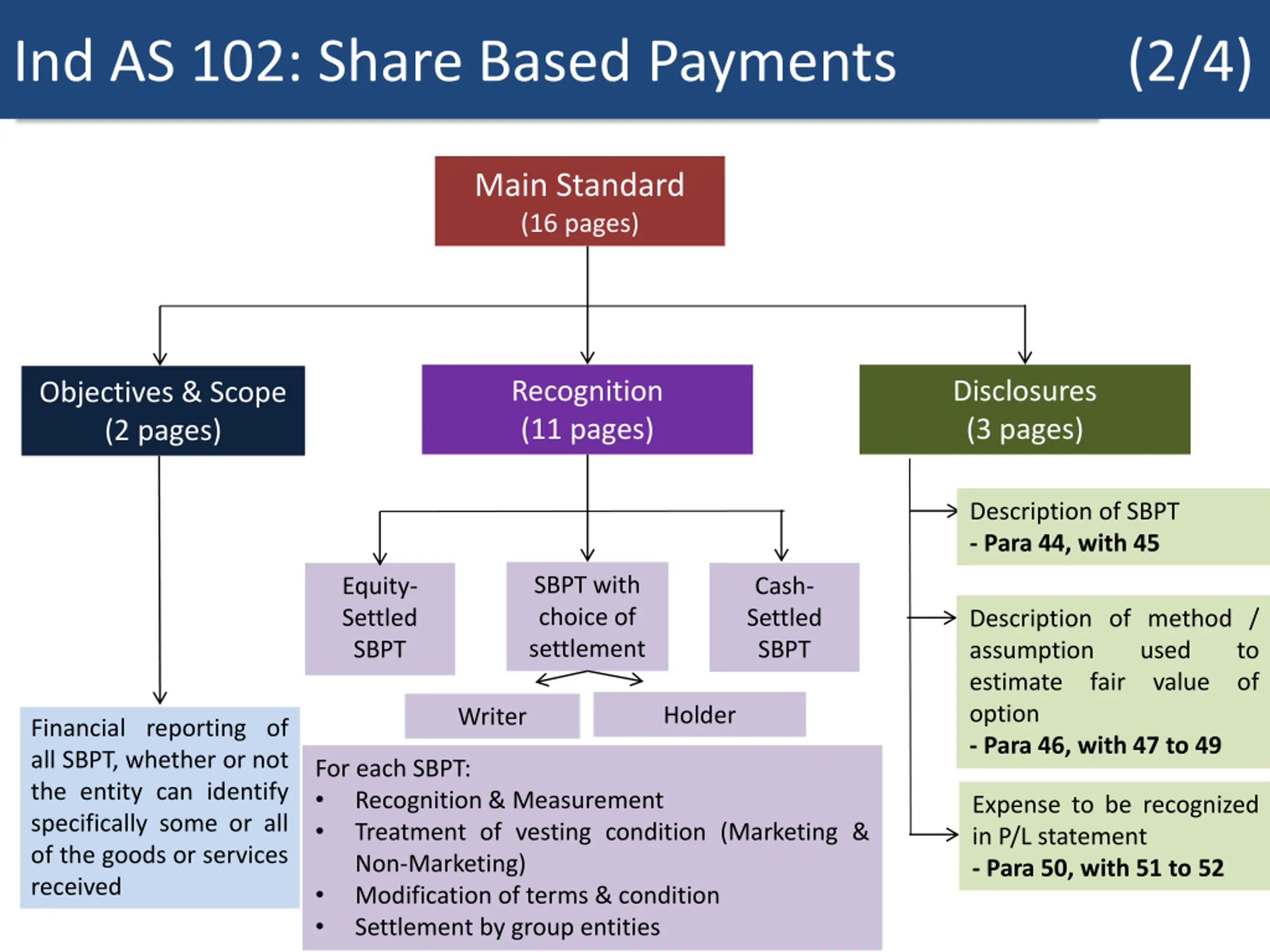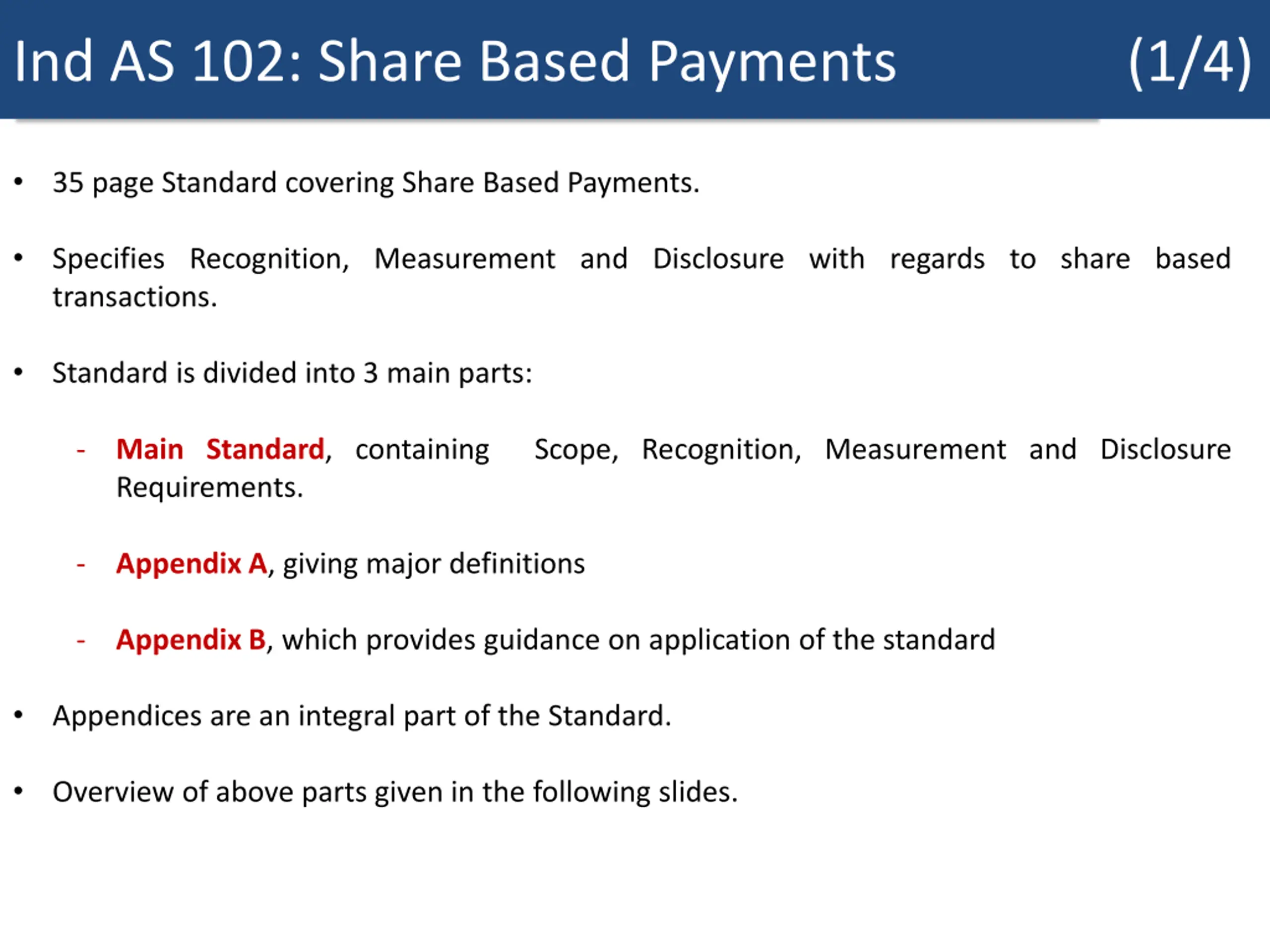The Black Scholes Formulas Ind AS 102: Share Based Payments (1/4) 35 page Standard covering Share Based Payments. Specifies Recognition, Measurement and Disclosure with regards to share based transactions. Standard is divided into 3 main parts: - Main Standard, containing Scope, Recognition, Measurement and Disclosure Requirements. - Appendix A, giving major definitions - Appendix B, which provides guidance on application of the standard Appendices are an integral part of the Standard. Overview of above parts given in the following slides.
