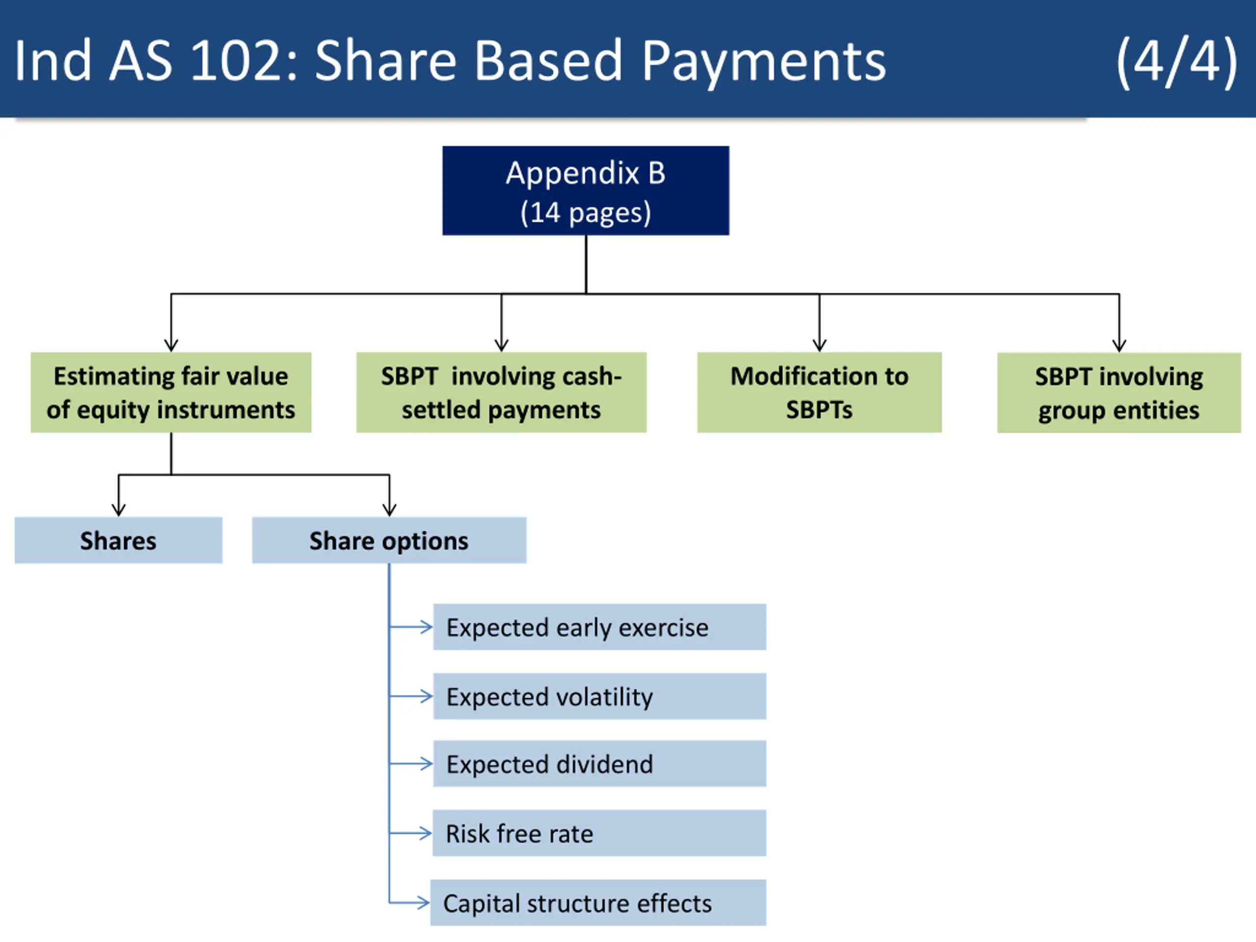 The Black Scholes Formulas Ind AS 102: Share Based Payments (4/4) Appendix B (14 pages) Estimating fair value of equity instruments SBPT involving cash- settled payments Modification to SBPTs SBPT involving group entities Shares Share options Expected early exercise Expected volatility Expected dividend Risk free rate Capital structure effects