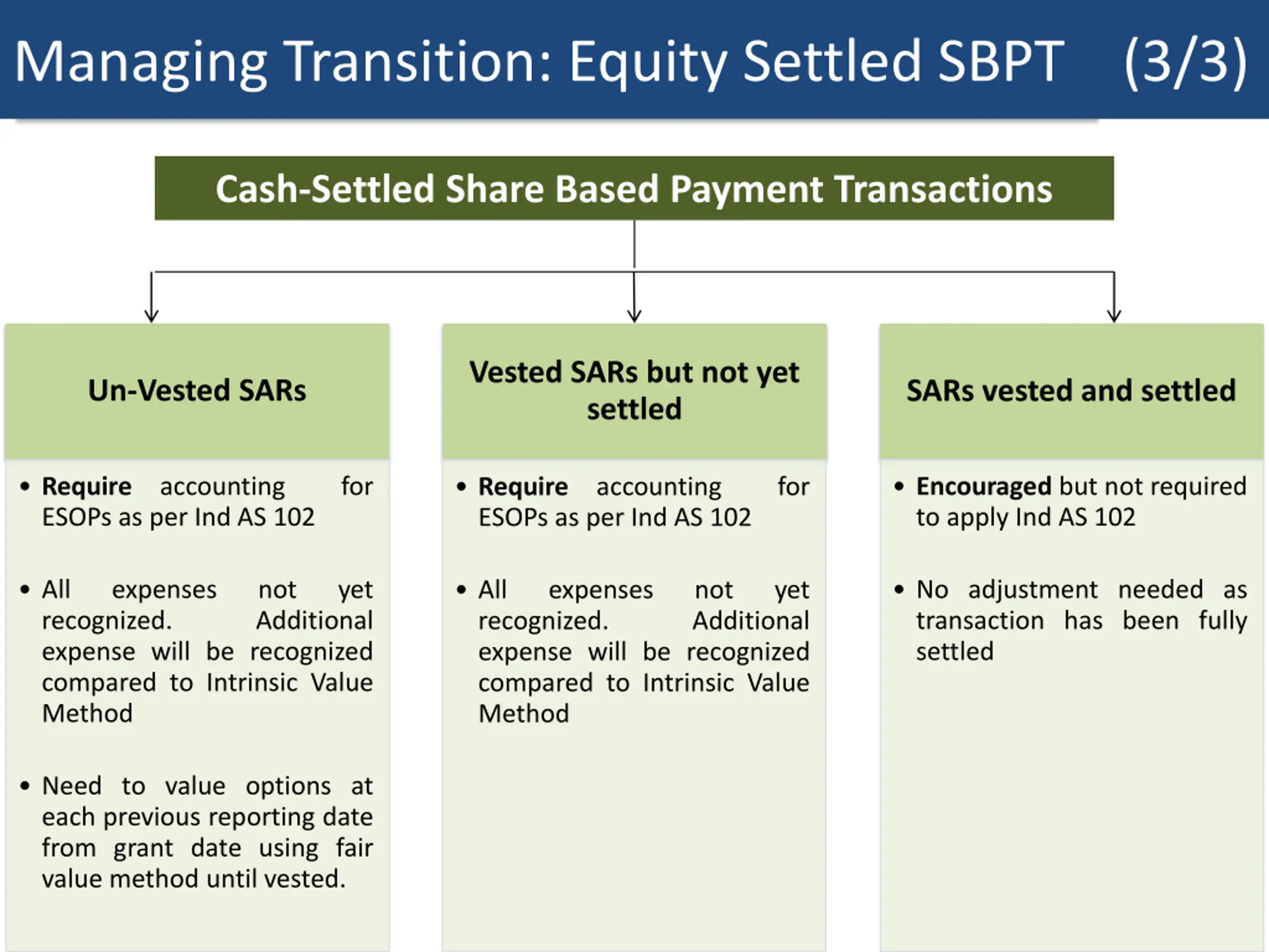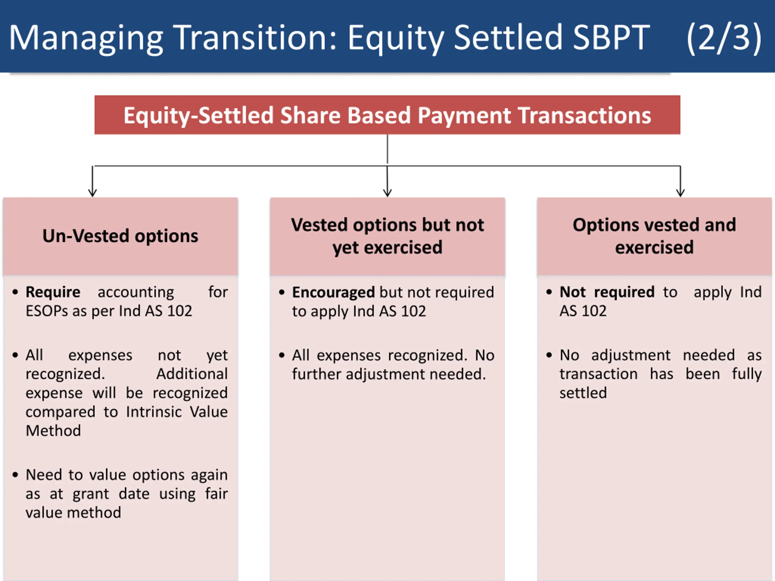 The Black Scholes Formulas Managing Transition: Equity Settled SBPT (2/3) Equity-Settled Share Based Payment Transactions Vested options but not yet exercised Options vested and exercised Un-Vested options Require accounting for ESOPs as per Ind AS 102 Not required to apply Ind AS 102 Encouraged but not required to apply Ind AS 102 All recognized. expense will be recognized compared to Intrinsic Value Method expenses not Additional yet No adjustment needed as transaction has been fully settled All expenses recognized. No further adjustment needed. Need to value options again as at grant date using fair value method
