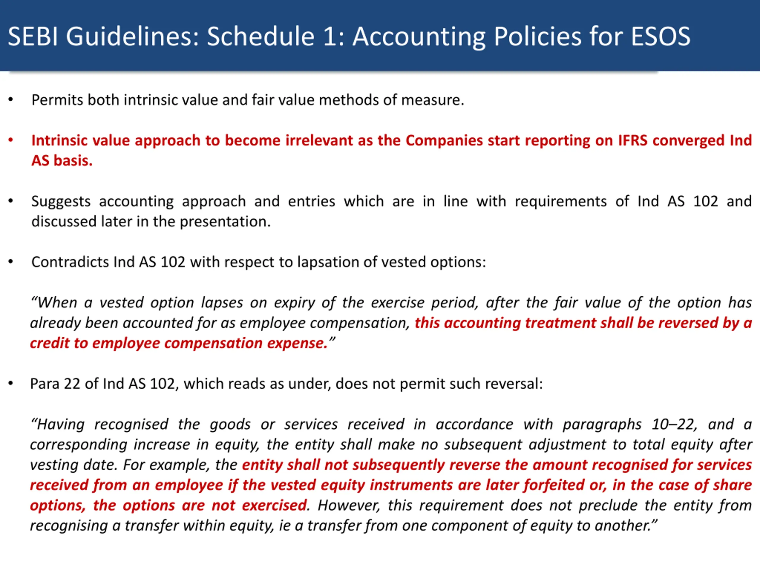 The Black Scholes Formulas SEBI Guidelines: Schedule 1: Accounting Policies for ESOS Permits both intrinsic value and fair value methods of measure. Intrinsic value approach to become irrelevant as the Companies start reporting on IFRS converged Ind AS basis. Suggests accounting approach and entries which are in line with requirements of Ind AS 102 and discussed later in the presentation. Contradicts Ind AS 102 with respect to lapsation of vested options: When a vested option lapses on expiry of the exercise period, after the fair value of the option has already been accounted for as employee compensation, this accounting treatment shall be reversed by a credit to employee compensation expense. Para 22 of Ind AS 102, which reads as under, does not permit such reversal: Having recognised the goods or services received in accordance with paragraphs 10 22, and a corresponding increase in equity, the entity shall make no subsequent adjustment to total equity after vesting date. For example, the entity shall not subsequently reverse the amount recognised for services received from an employee if the vested equity instruments are later forfeited or, in the case of share options, the options are not exercised. However, this requirement does not preclude the entity from recognising a transfer within equity, ie a transfer from one component of equity to another.
