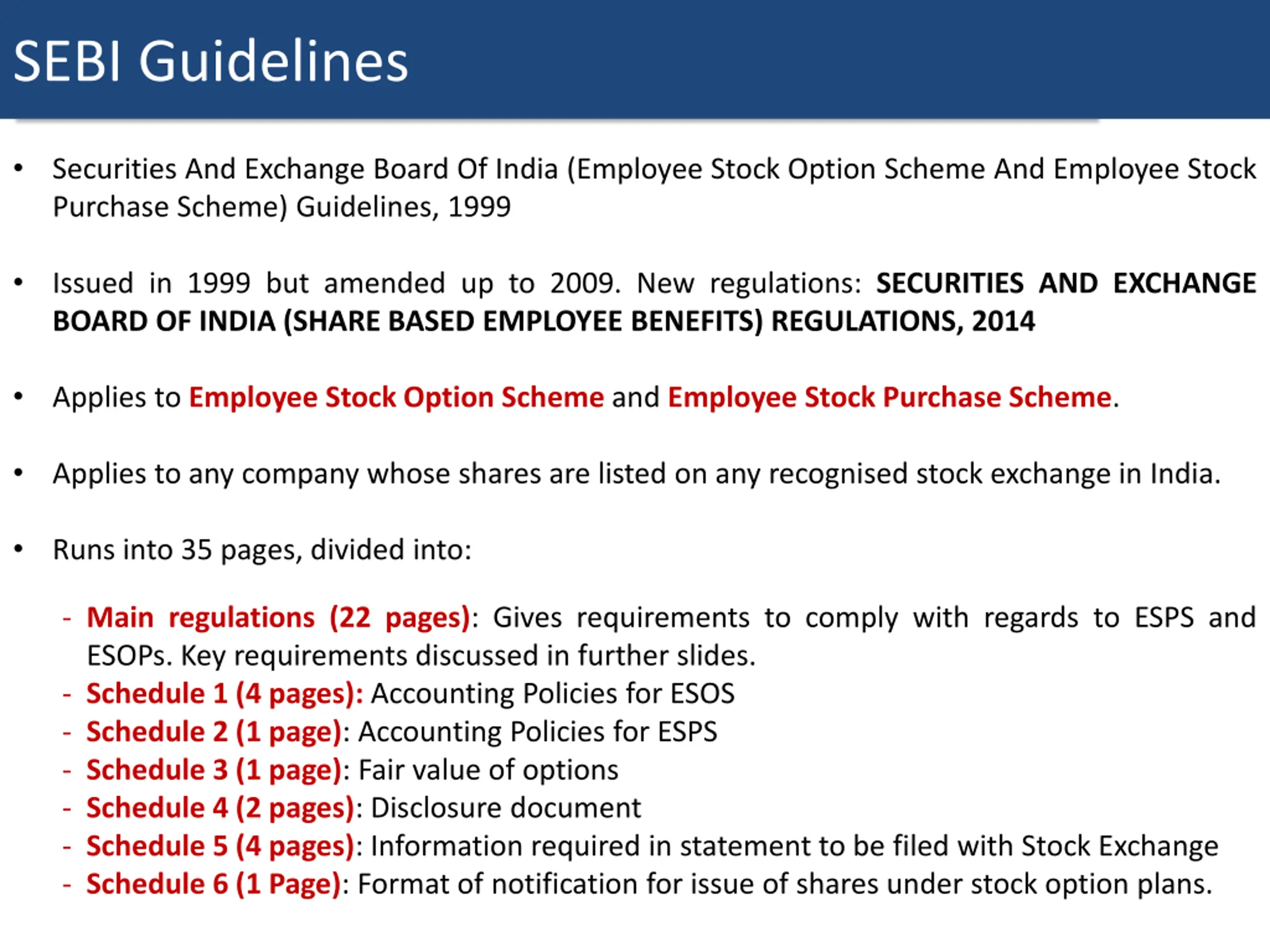 The Black Scholes Formulas SEBI Guidelines Securities And Exchange Board Of India (Employee Stock Option Scheme And Employee Stock Purchase Scheme) Guidelines, 1999 Issued in 1999 but amended up to 2009. New regulations: SECURITIES AND EXCHANGE BOARD OF INDIA (SHARE BASED EMPLOYEE BENEFITS) REGULATIONS, 2014 Applies to Employee Stock Option Scheme and Employee Stock Purchase Scheme. Applies to any company whose shares are listed on any recognised stock exchange in India. Runs into 35 pages, divided into: - Main regulations (22 pages): Gives requirements to comply with regards to ESPS and ESOPs. Key requirements discussed in further slides. - Schedule 1 (4 pages): Accounting Policies for ESOS - Schedule 2 (1 page): Accounting Policies for ESPS - Schedule 3 (1 page): Fair value of options - Schedule 4 (2 pages): Disclosure document - Schedule 5 (4 pages): Information required in statement to be filed with Stock Exchange - Schedule 6 (1 Page): Format of notification for issue of shares under stock option plans.