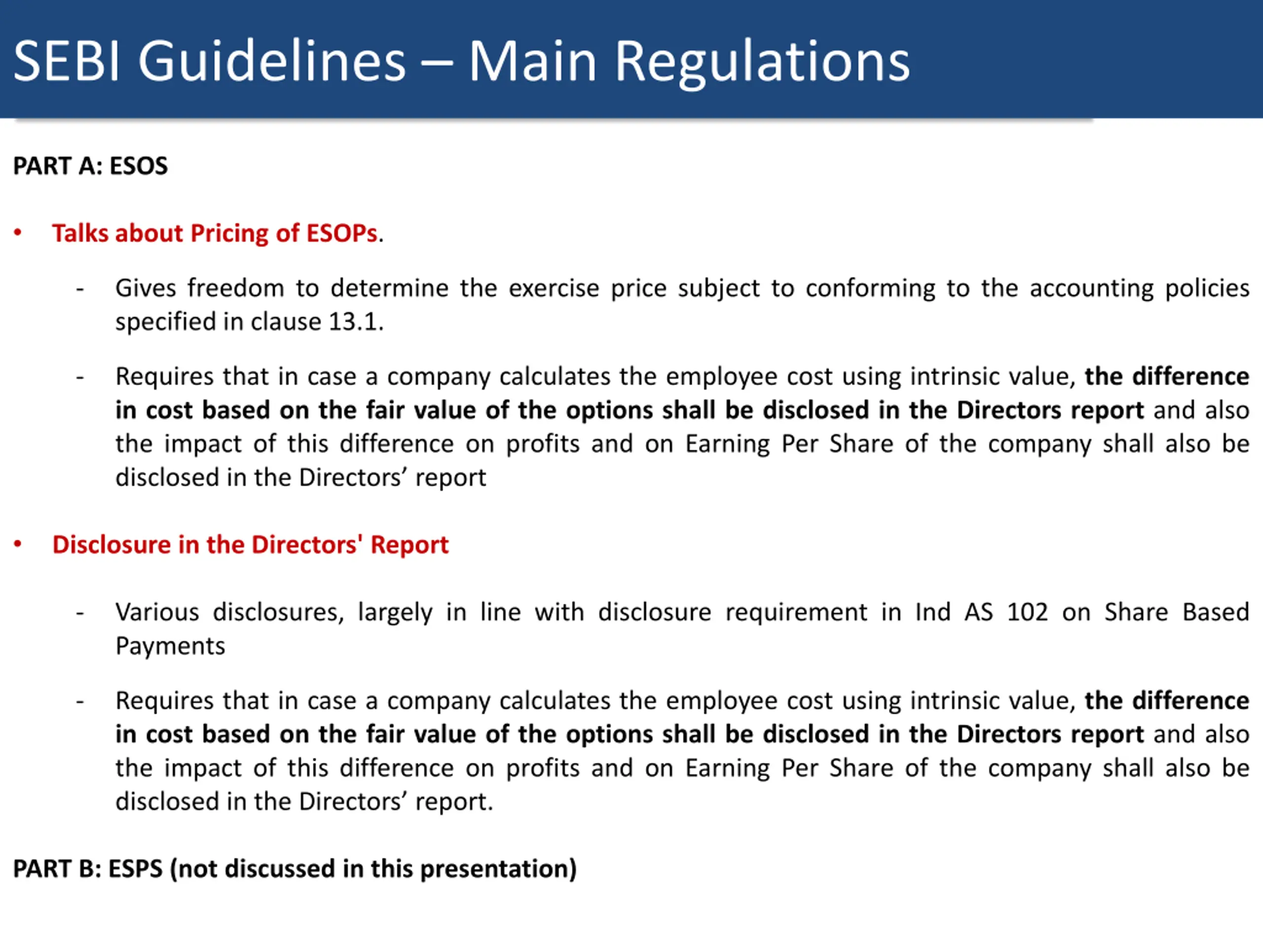 The Black Scholes Formulas SEBI Guidelines Main Regulations PART A: ESOS Talks about Pricing of ESOPs. - Gives freedom to determine the exercise price subject to conforming to the accounting policies specified in clause 13.1. - Requires that in case a company calculates the employee cost using intrinsic value, the difference in cost based on the fair value of the options shall be disclosed in the Directors report and also the impact of this difference on profits and on Earning Per Share of the company shall also be disclosed in the Directors report Disclosure in the Directors' Report - Various disclosures, largely in line with disclosure requirement in Ind AS 102 on Share Based Payments - Requires that in case a company calculates the employee cost using intrinsic value, the difference in cost based on the fair value of the options shall be disclosed in the Directors report and also the impact of this difference on profits and on Earning Per Share of the company shall also be disclosed in the Directors report. PART B: ESPS (not discussed in this presentation)