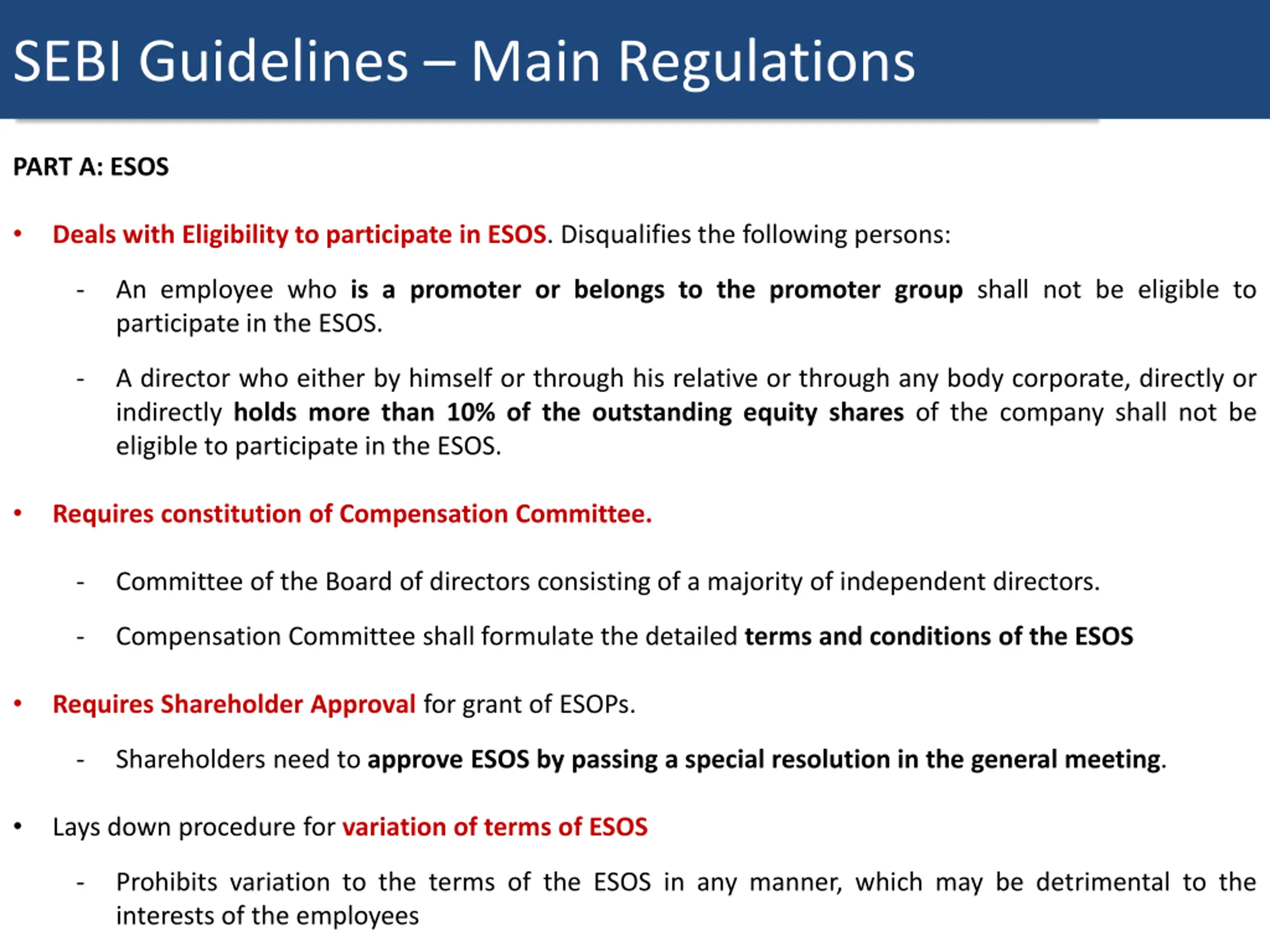 The Black Scholes Formulas SEBI Guidelines Main Regulations PART A: ESOS Deals with Eligibility to participate in ESOS. Disqualifies the following persons: - An employee who is a promoter or belongs to the promoter group shall not be eligible to participate in the ESOS. - A director who either by himself or through his relative or through any body corporate, directly or indirectly holds more than 10% of the outstanding equity shares of the company shall not be eligible to participate in the ESOS. Requires constitution of Compensation Committee. - Committee of the Board of directors consisting of a majority of independent directors. - Compensation Committee shall formulate the detailed terms and conditions of the ESOS Requires Shareholder Approval for grant of ESOPs. - Shareholders need to approve ESOS by passing a special resolution in the general meeting. Lays down procedure for variation of terms of ESOS - Prohibits variation to the terms of the ESOS in any manner, which may be detrimental to the interests of the employees