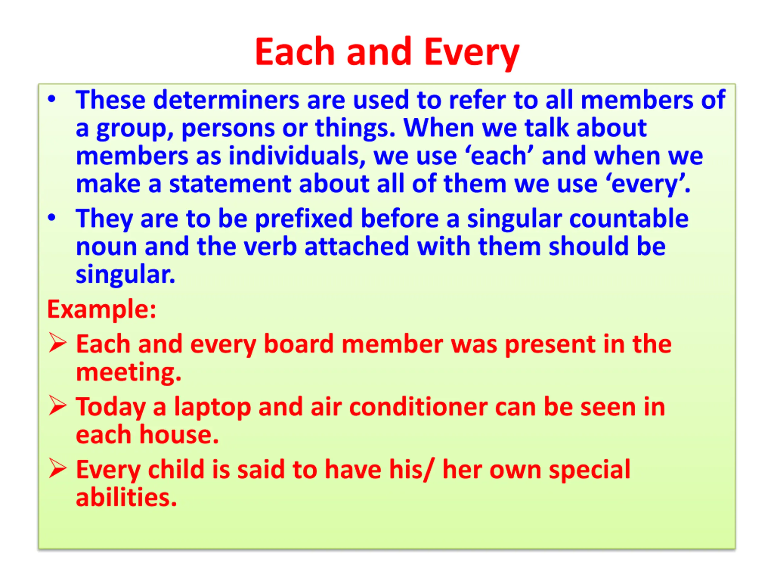 Each and Every These determiners are used to refer to all members of a group, persons or things. When we talk about members as individuals, we use each and when we make a statement about all of them we use every . They are to be prefixed before a singular countable noun and the verb attached with them should be singular. Example: Each and every board member was present in the meeting. Today a laptop and air conditioner can be seen in each house. Every child is said to have his/ her own special abilities.
