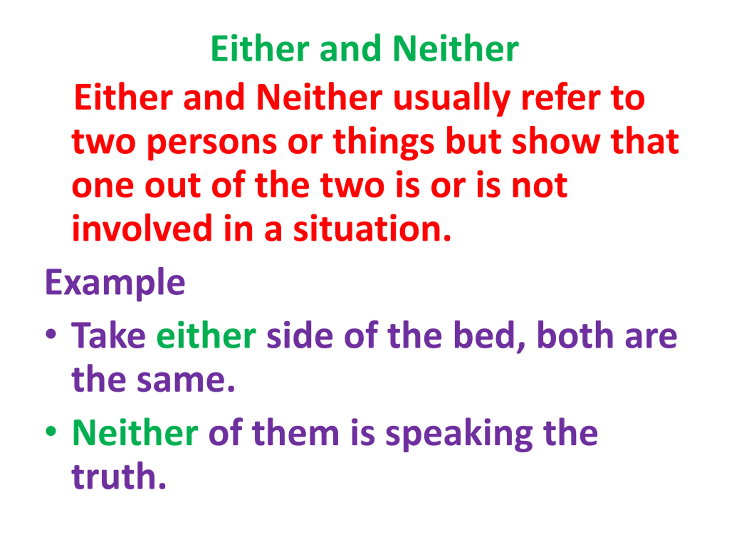 Either and Neither Either and Neither usually refer to two persons or things but show that one out of the two is or is not involved in a situation. Example Take either side of the bed, both are the same. Neither of them is speaking the truth.
